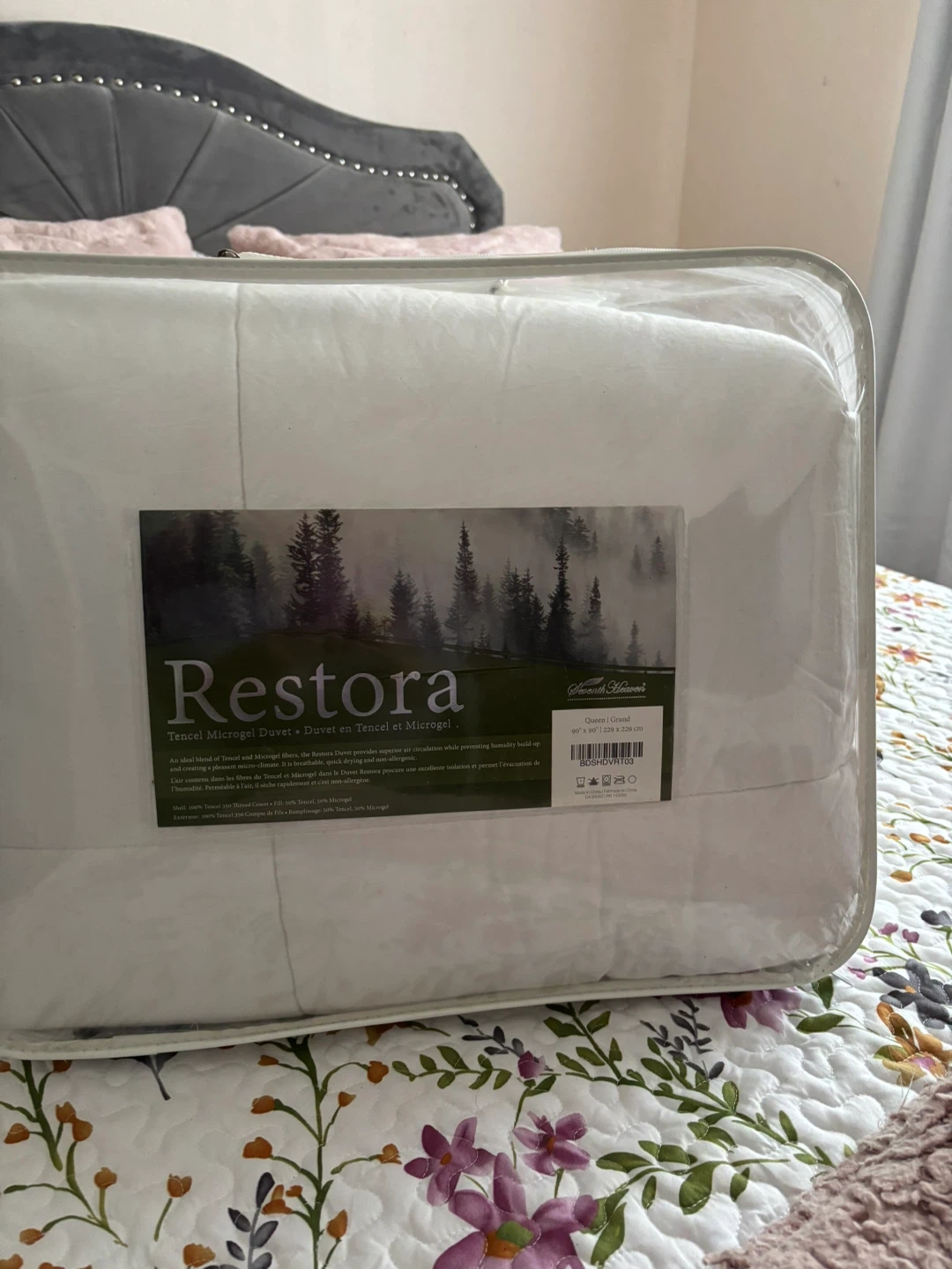 Selling a Restora Tencel Microgel Duvet in Queen size! It's still in its original packaging. The duvet is made with Tencel and microgel, making it breathable, quick-drying, and moisture-wicking. It's designed to keep you comfortable all night long! Perfect for a cozy night's sleep
