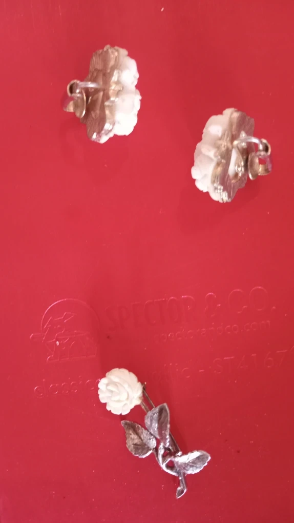 Selling a lovely vintage set featuring a flower brooch and matching clip on earrings. The set has a delicate floral design and would be a charming addition to any collection
