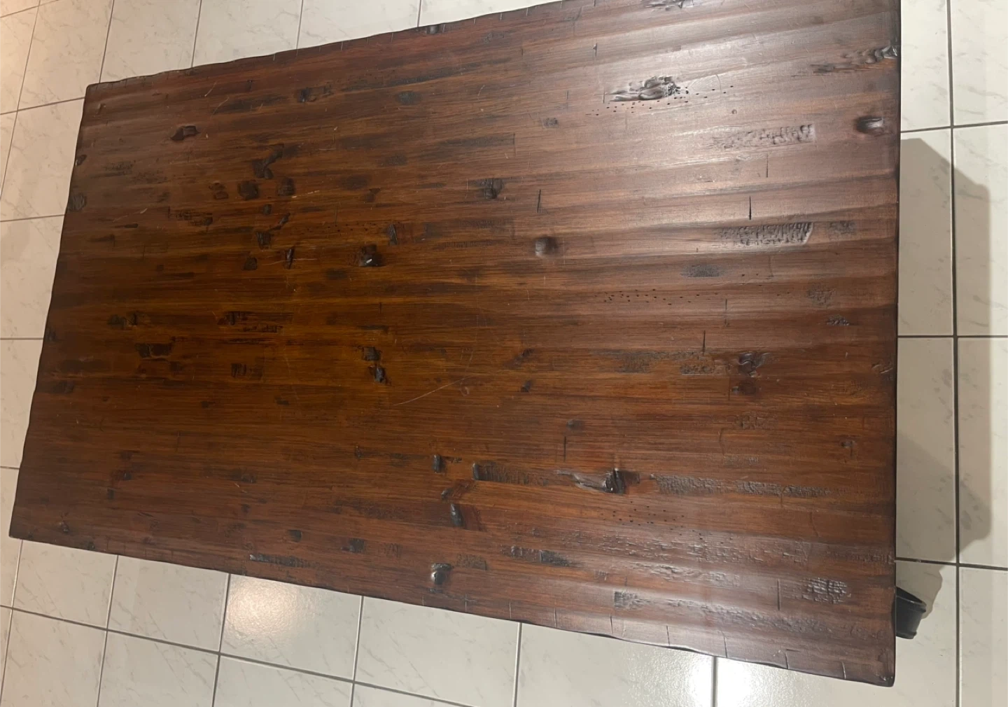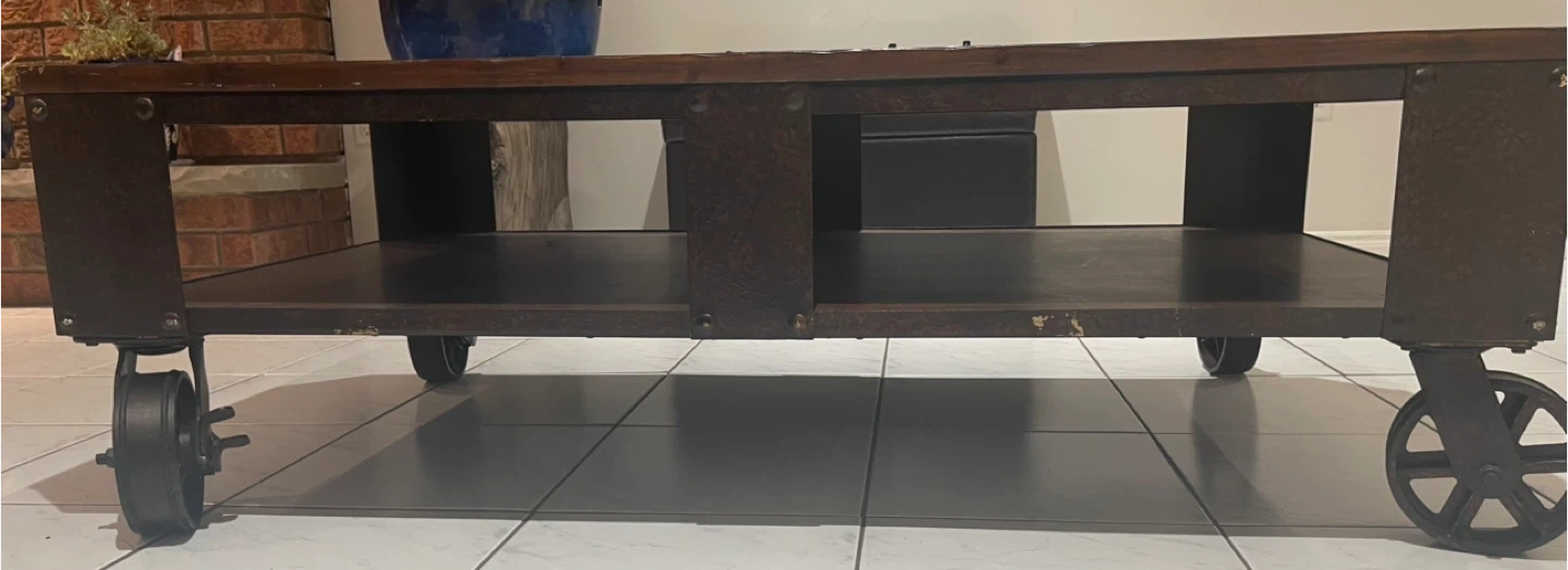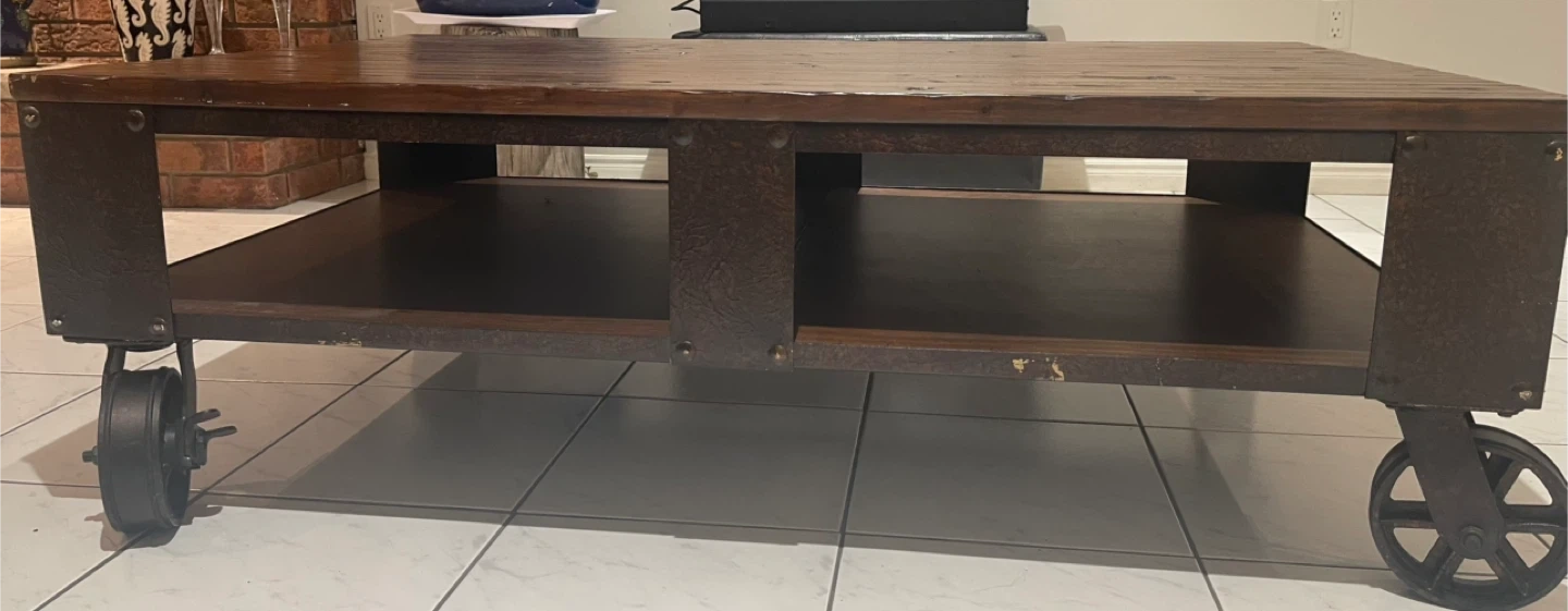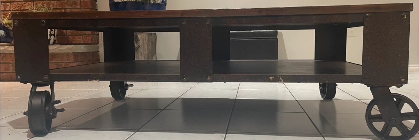 Selling a rustic-style coffee table with a wooden top and metal frame. It features functional wheels, making it easy to move around your living space. The table also has a lower shelf for additional storage or display.