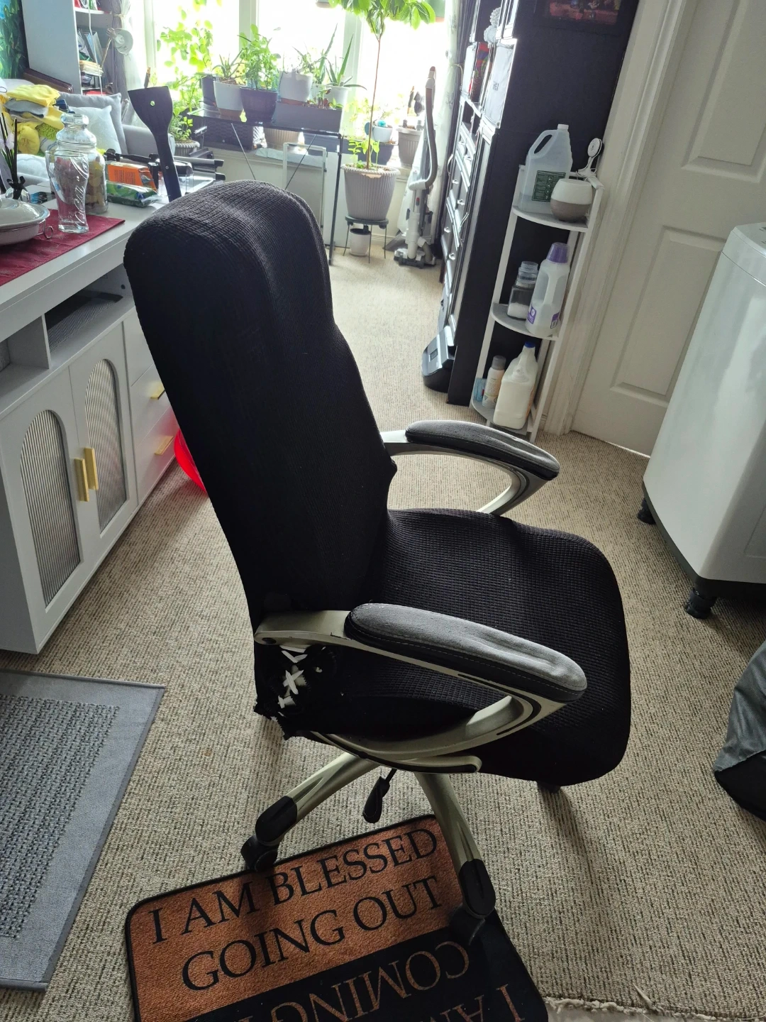 Selling a black office chair. It has some wear and tear on the sides, as shown in the photos. Still functions well and is comfortable for long hours of work or study