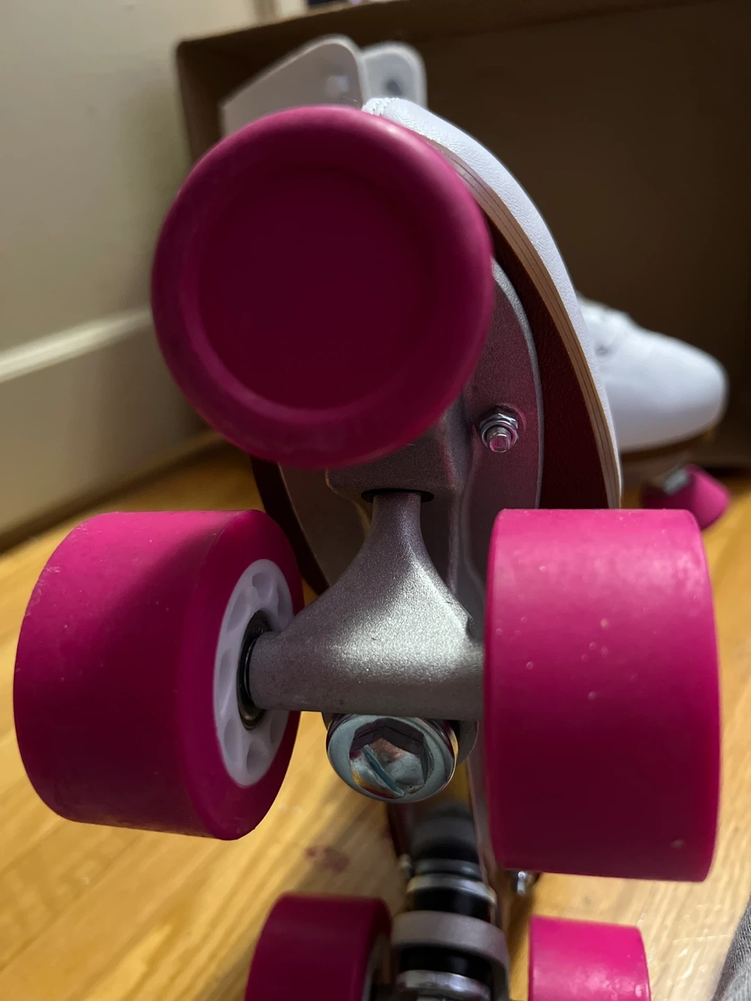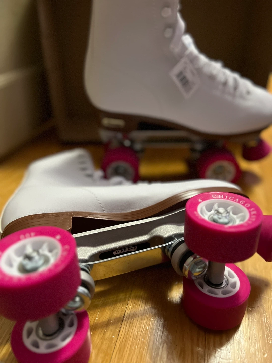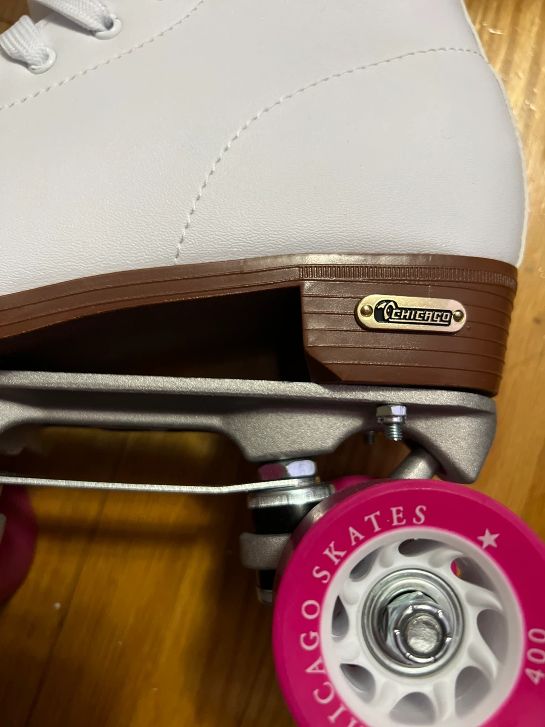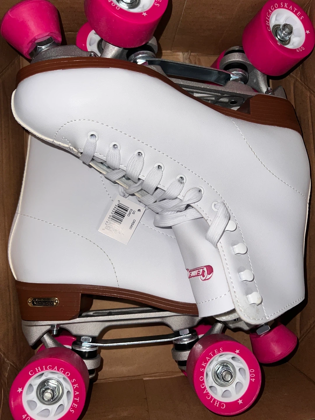 Selling a pair of Chicago Skates roller skates in ladies size 8. They're white with pink wheels and in great shape! The tag is still on them, so they're practically brand new. Comes with the original box