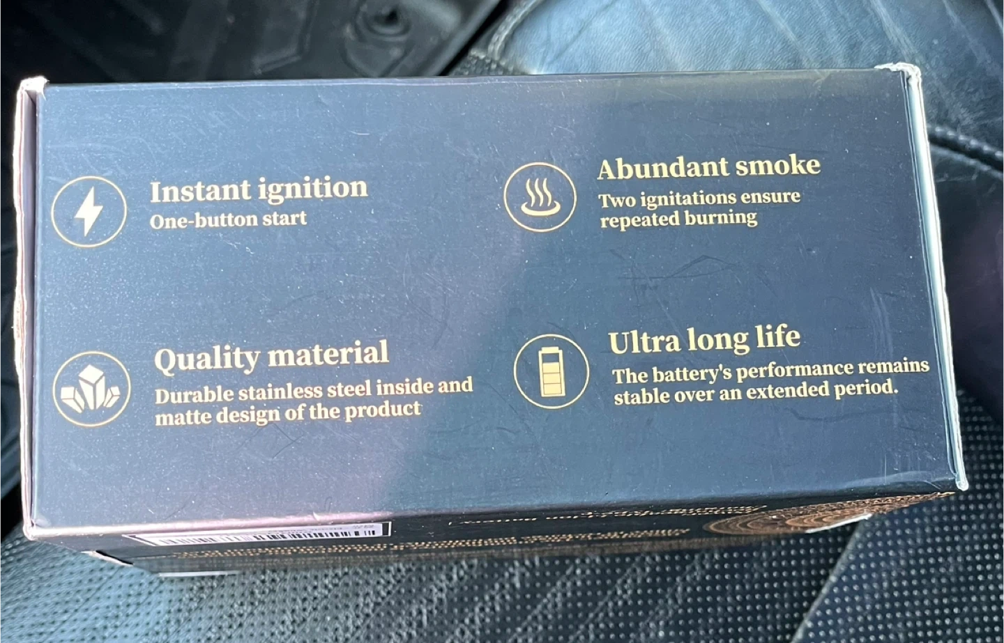 It features instant ignition with a one-button start and abundant smoke with two ignitions to ensure repeated burning. The quality material is durable stainless steel inside with a matte design. The battery's performance remains stable over an extended period, ensuring ultra-long life. It comes with natural wood chips.