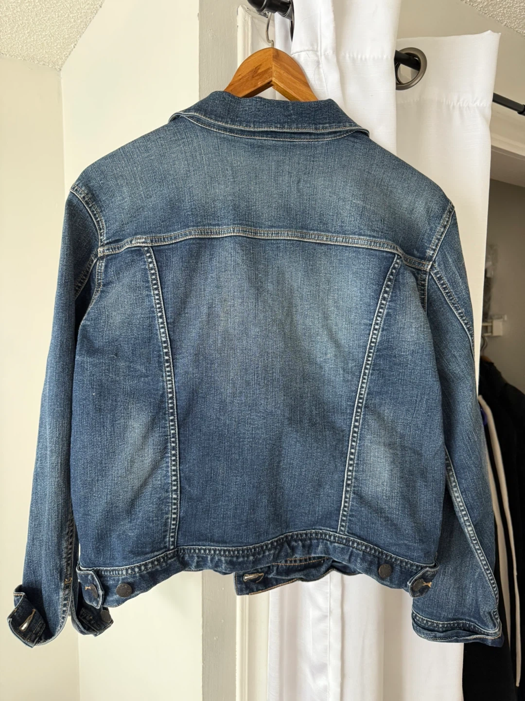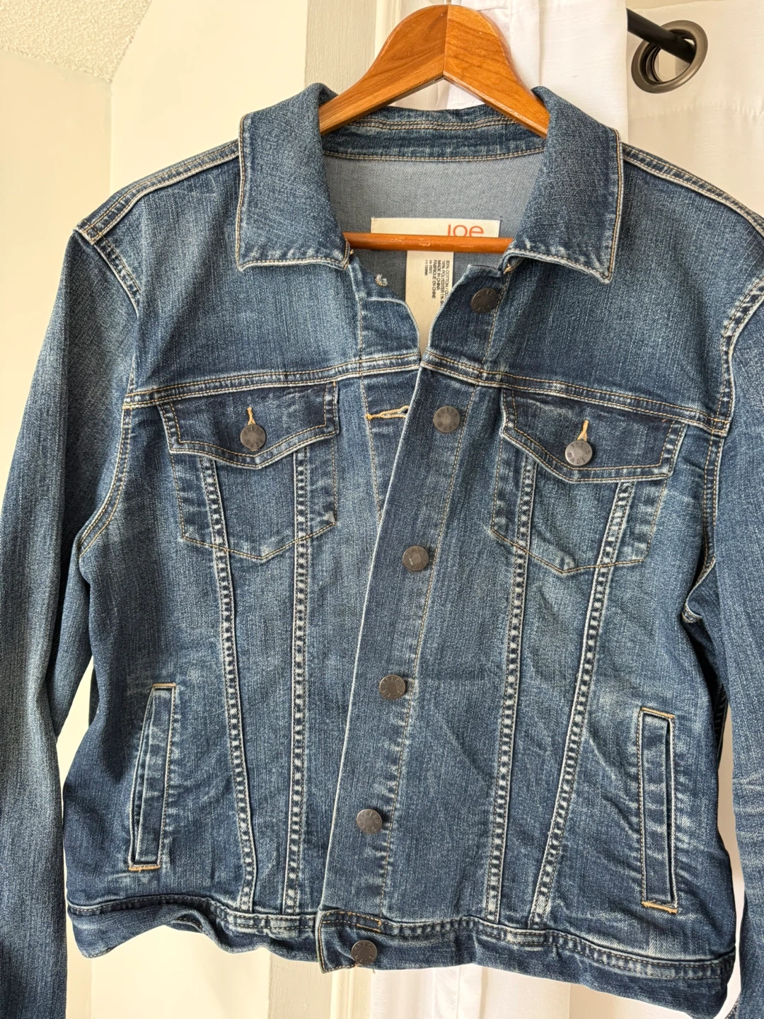 Here's a Joe Fresh denim jacket in size XL! It's made of 83% cotton, 16% polyester, and 1% spandex. Perfect for layering or wearing on its own