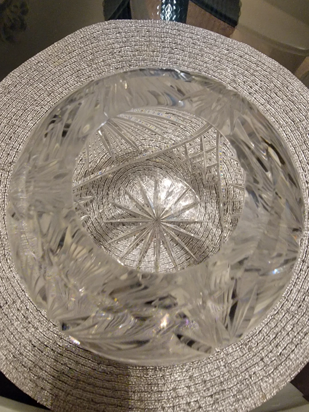Selling a lovely crystal vase! It's round and has a beautiful, intricate design. It would look great as a centrepiece or to display your favourite flowers