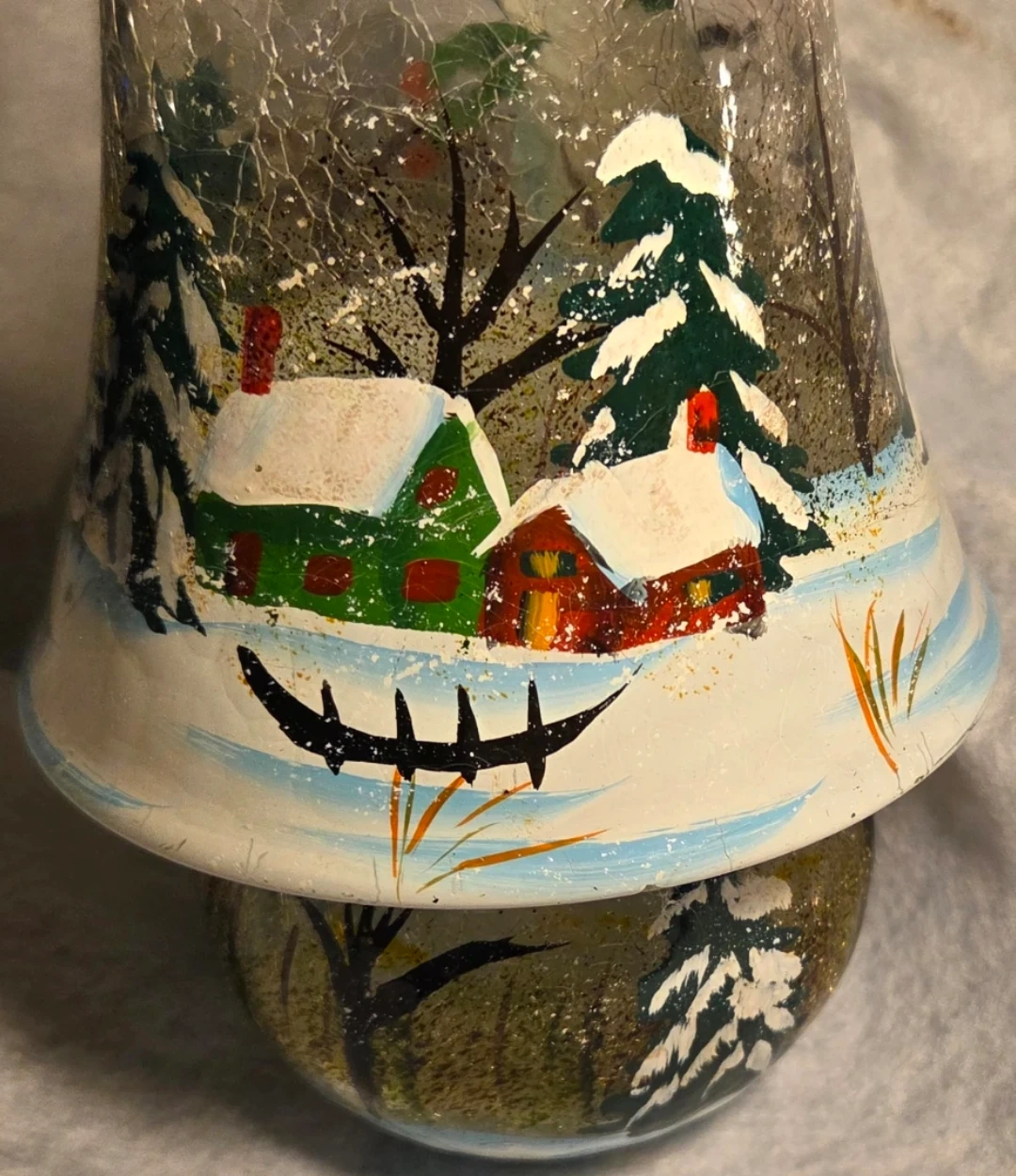 Here's a cute snowman painted glass candle holder! It has a wintery scene with snow-covered houses and trees. It's in great shape and ready to add some festive cheer to your home