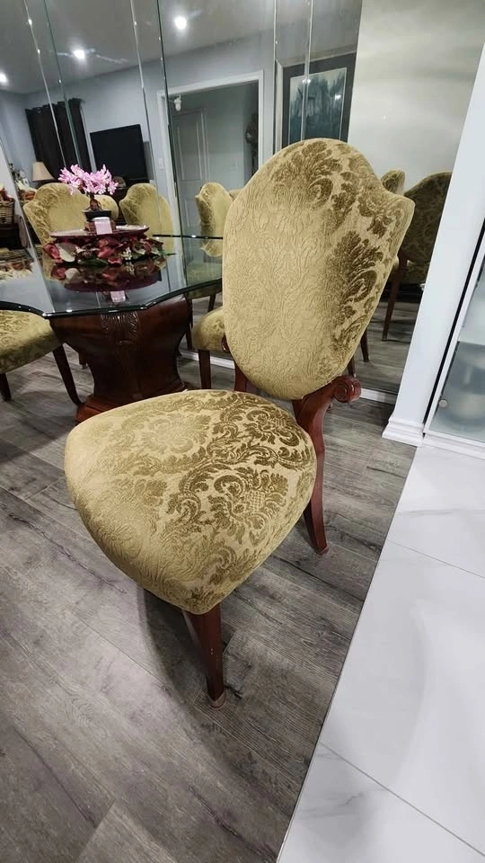 The glass top is very heavy, and two people will be required to move it safely. This glass Bombay dining table comes with four elegant French-style chairs that perfectly complement the table. This dining set has been well-loved and is looking for a new home.