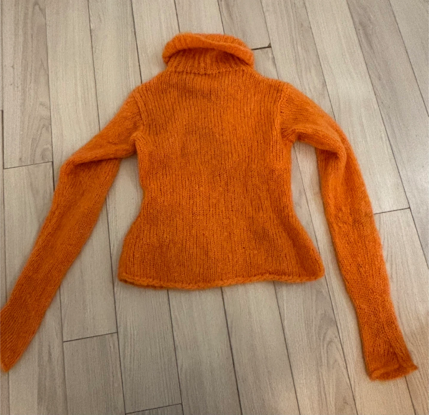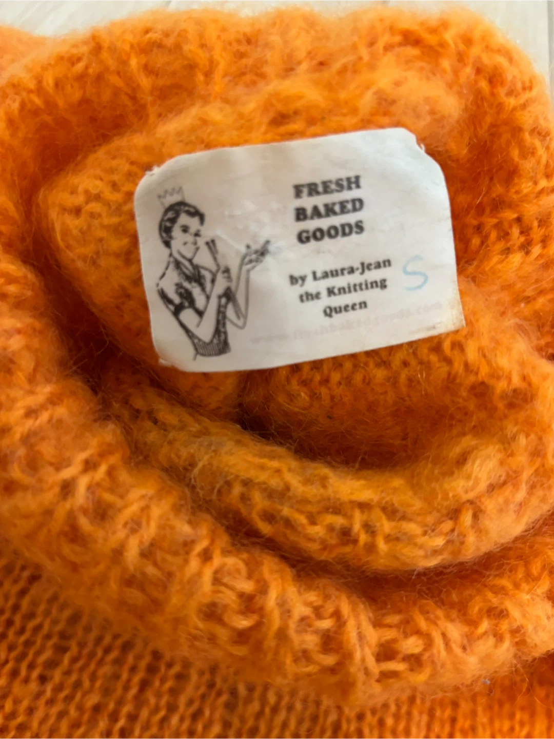 Selling a cozy, bright orange knit sweater from Toronto’s Fresh Baked Goods! It's a size small. unique, hand knit. Perfect for adding a pop of colour to your wardrobe! Right sleeve has some discolouration