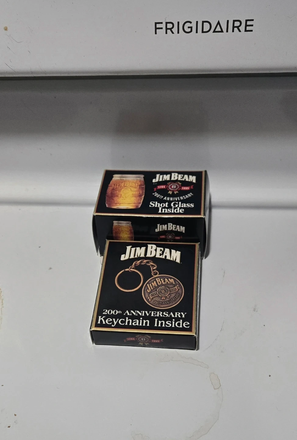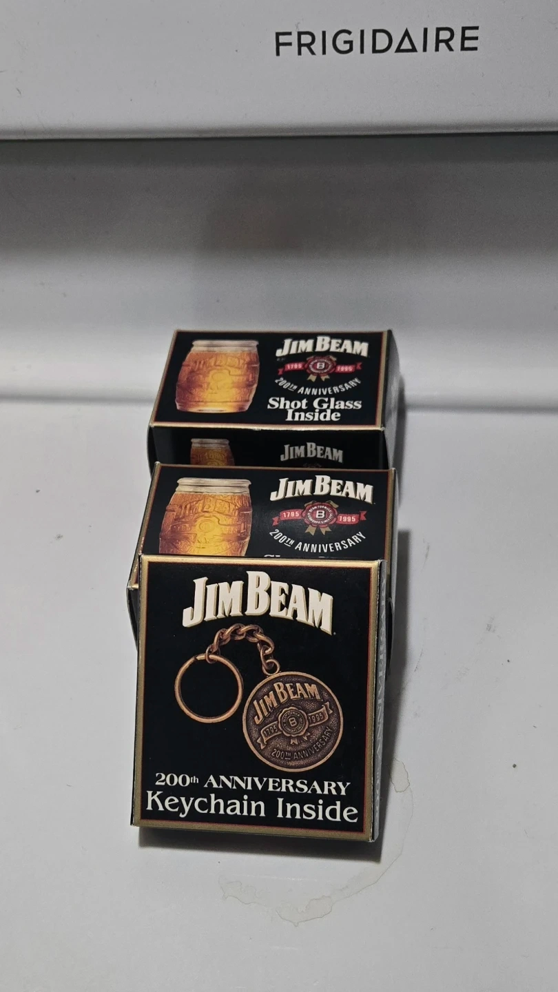 Selling a Jim Beam 200th Anniversary keychain and two shot glasses. The keychain and glasses come in their original boxes. Great for any Jim Beam collector!