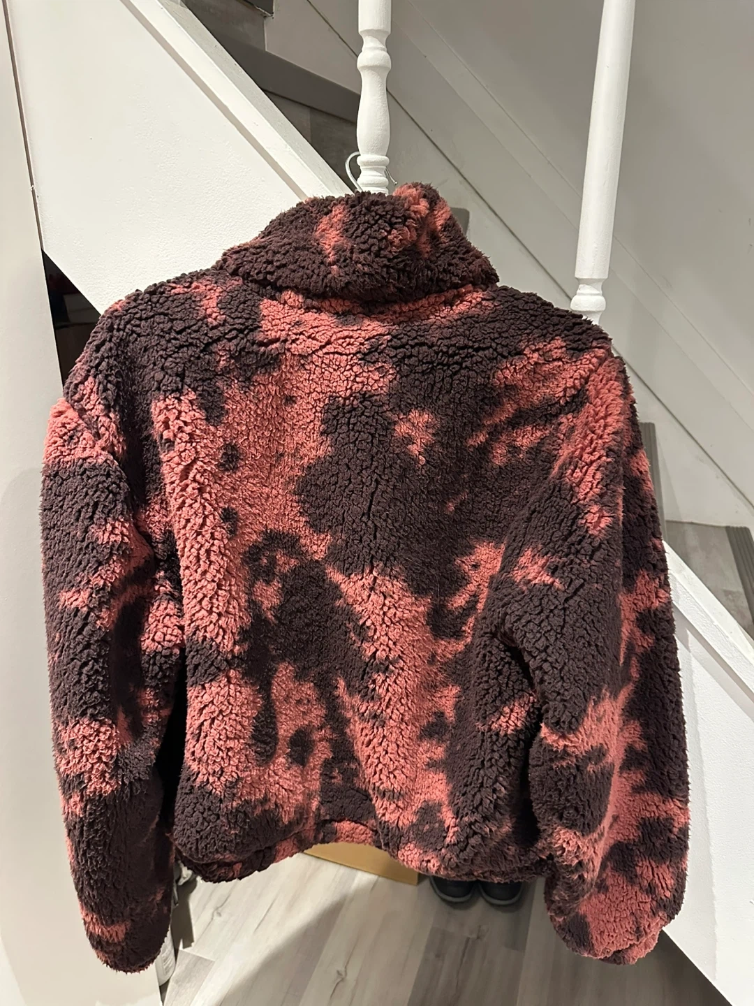 This jacket is a size small and is made of a soft, plush material, perfect for staying warm on chilly days.