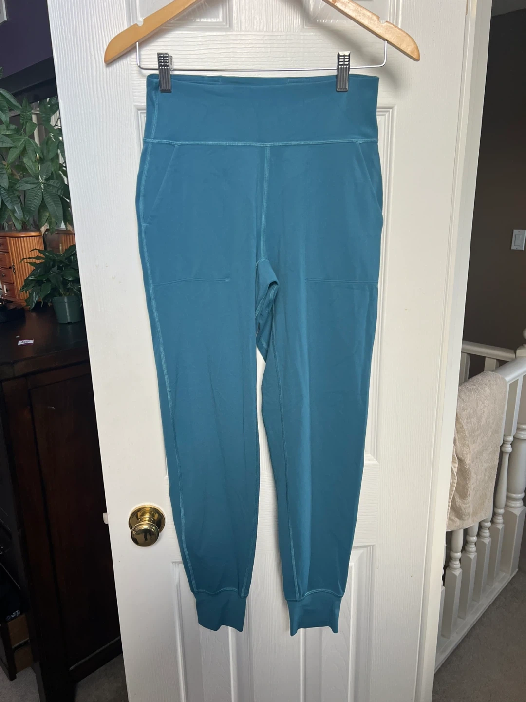 Selling a pair of Lululemon joggers in a beautiful teal colour! They are a size 6 and in great condition. Perfect for workouts or just lounging around