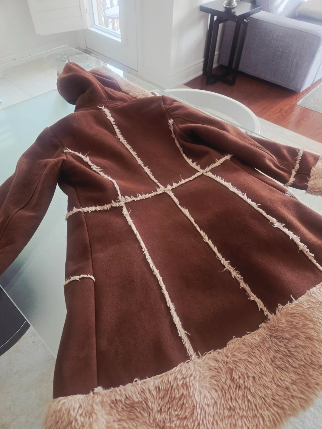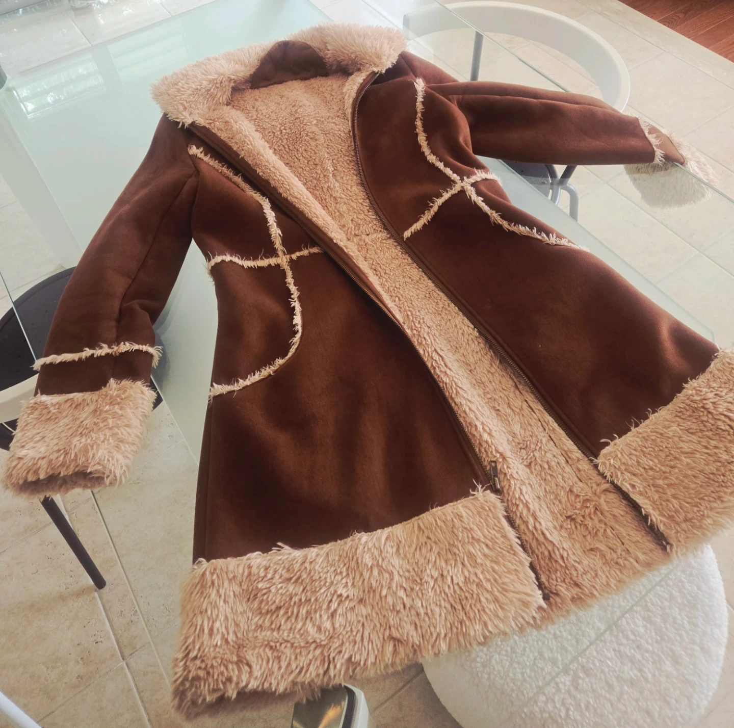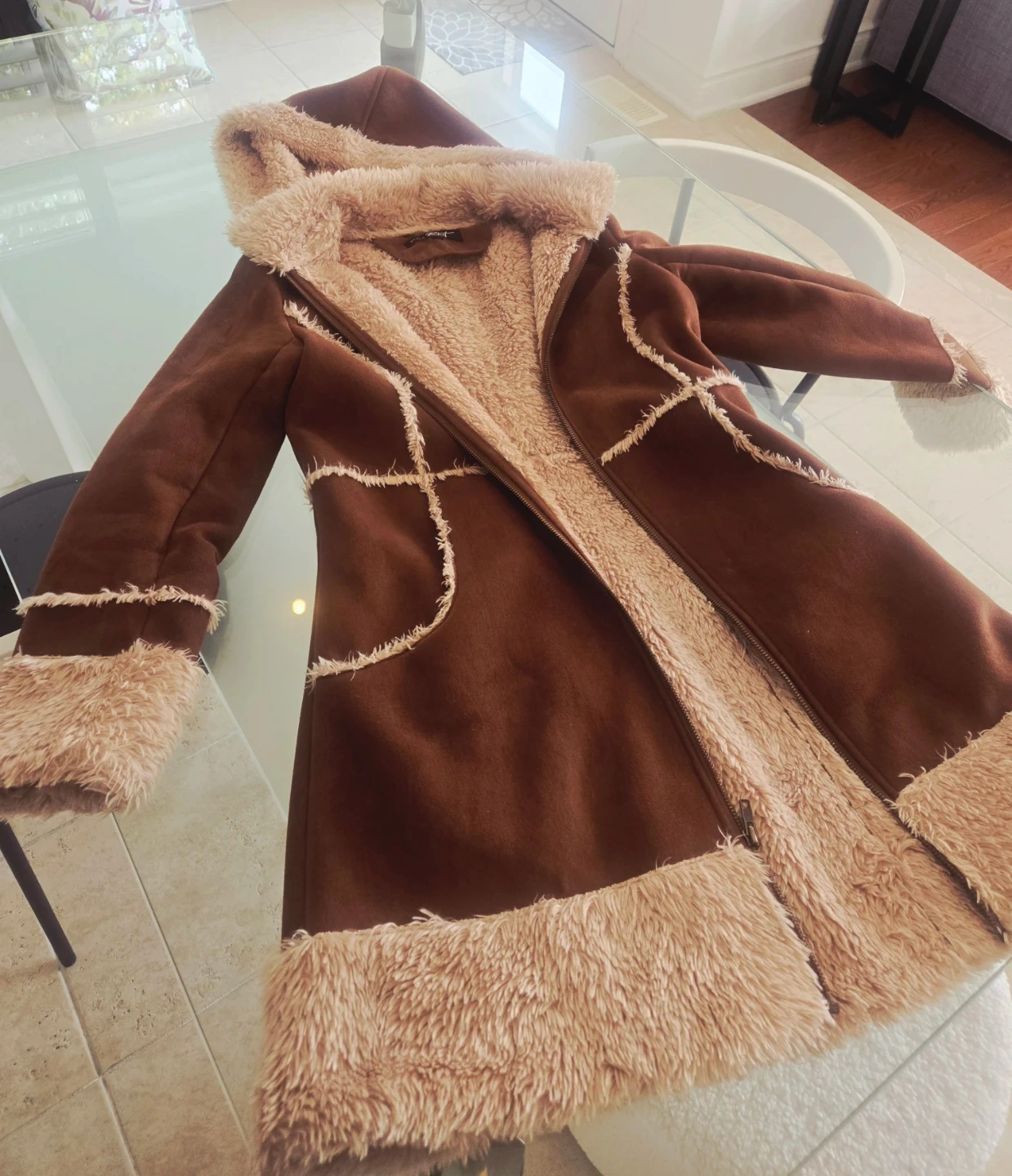 A cozy brown coat with faux suede exterior and fluffy fur trim! It's perfect for staying warm and stylish during the colder months. The coat features a hood and a zip-up front, making it easy to wear. The faux fur lining adds extra comfort and warmth