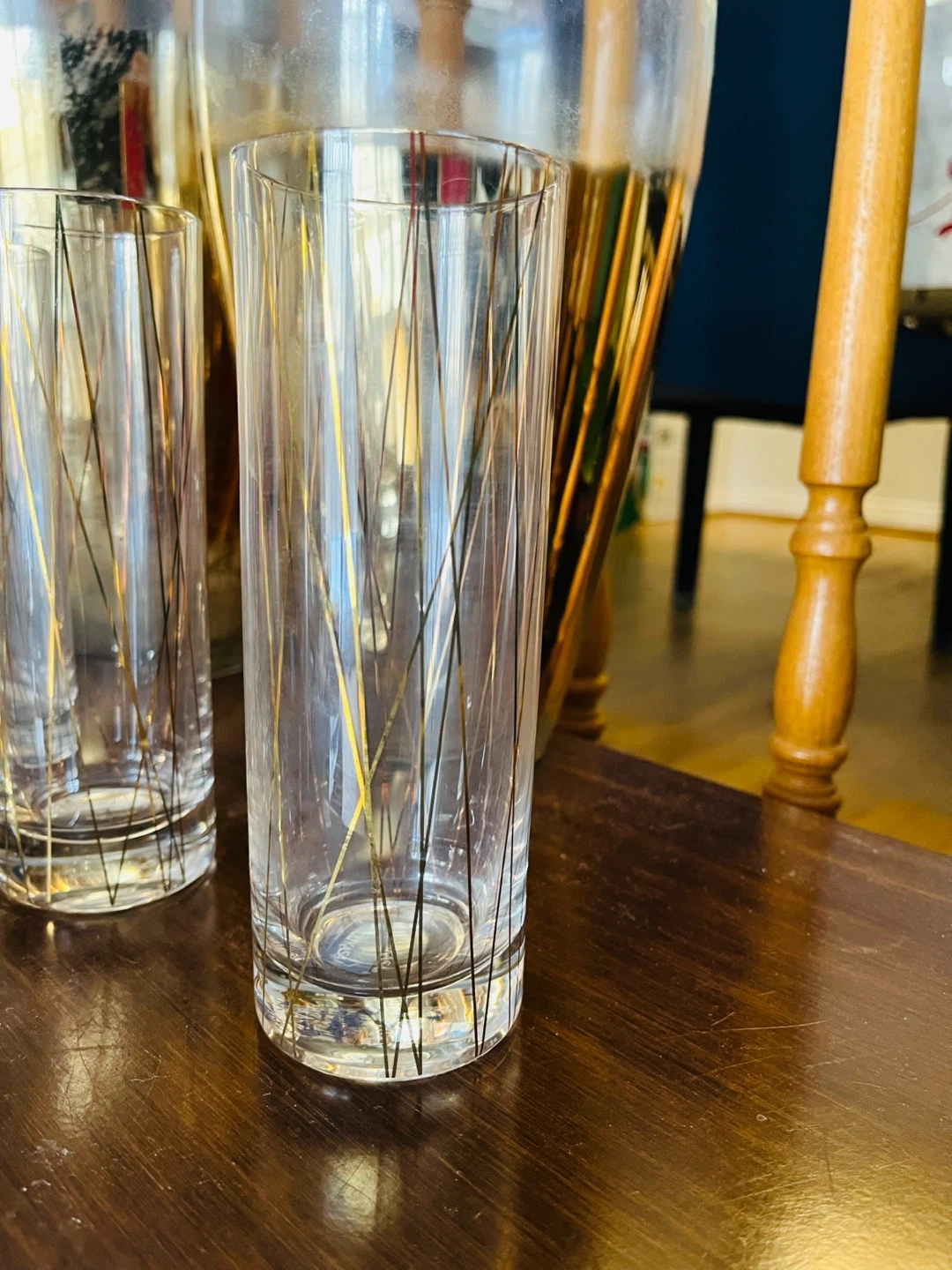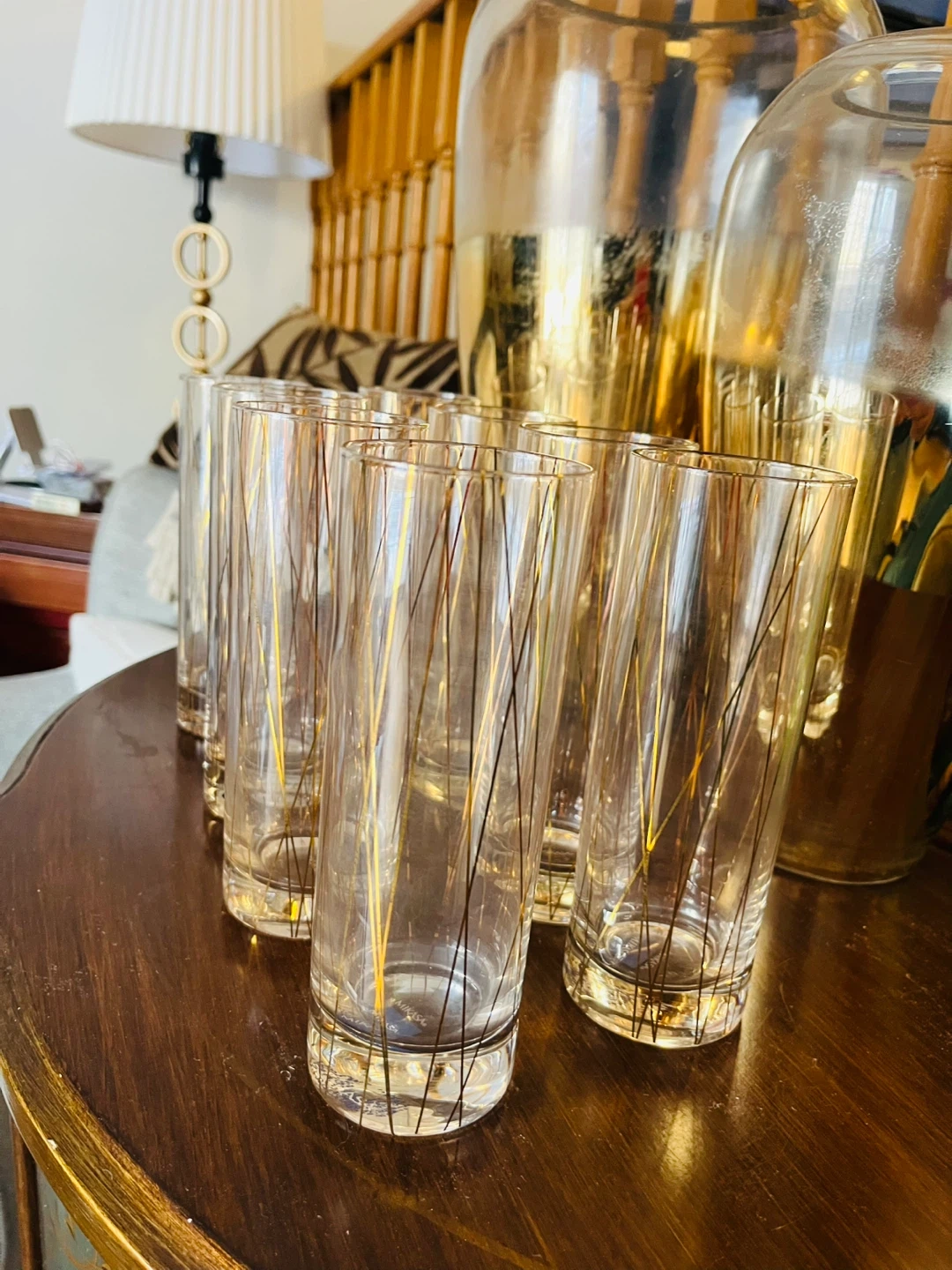 Never used, elegant gold-lustre Mikasa Tom Collins glasses set of 8. Perfect for cocktails, celebrations, or gifting. Set of 8 adds a touch of sparkle to any home bar!