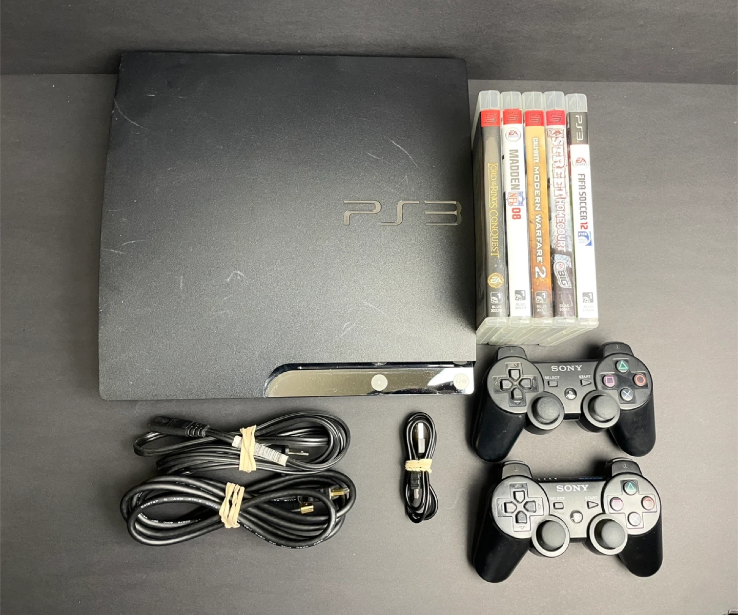 Selling a used Sony PlayStation 3 (PS3) console. It comes with a few games and two controllers.
