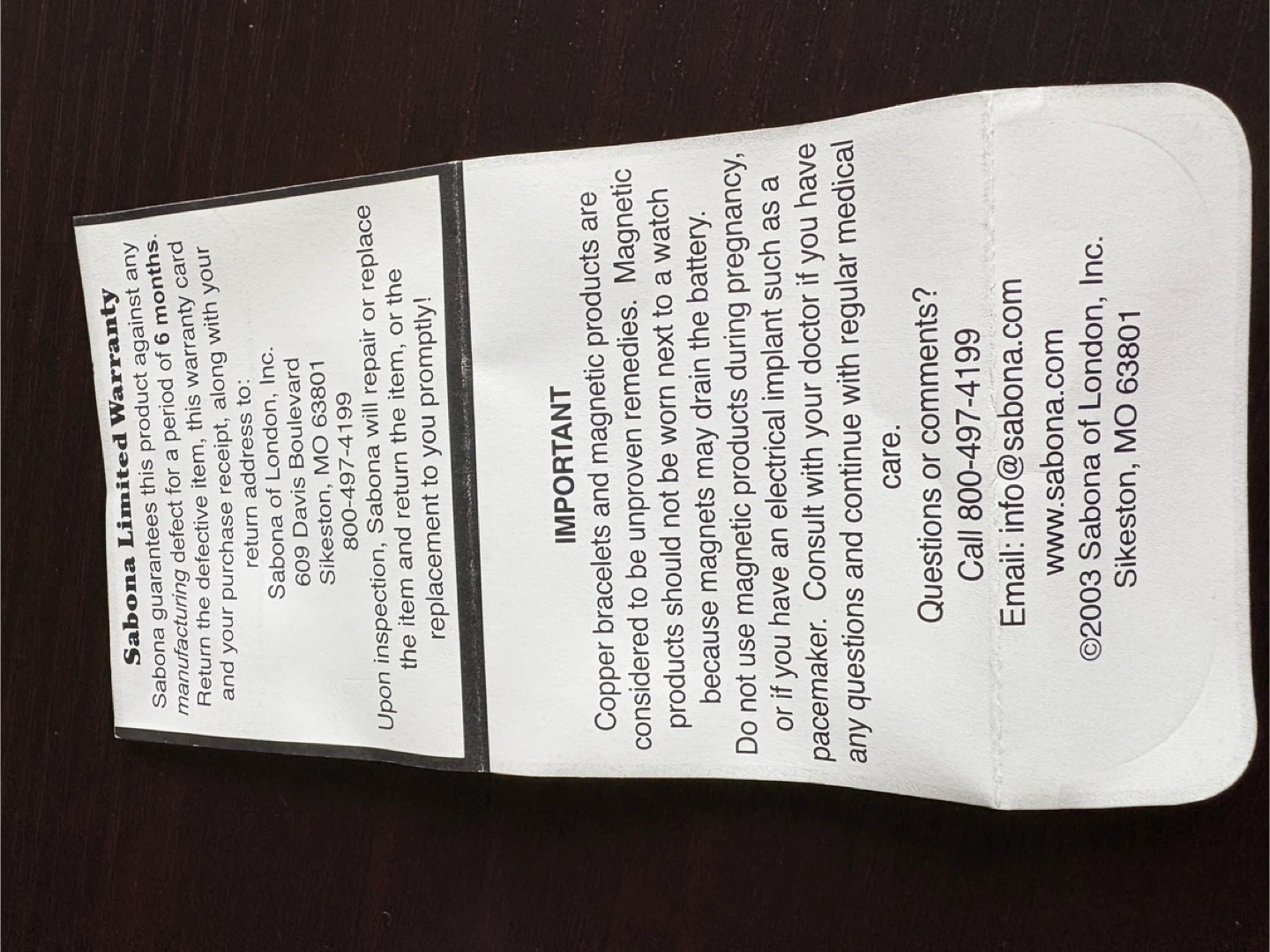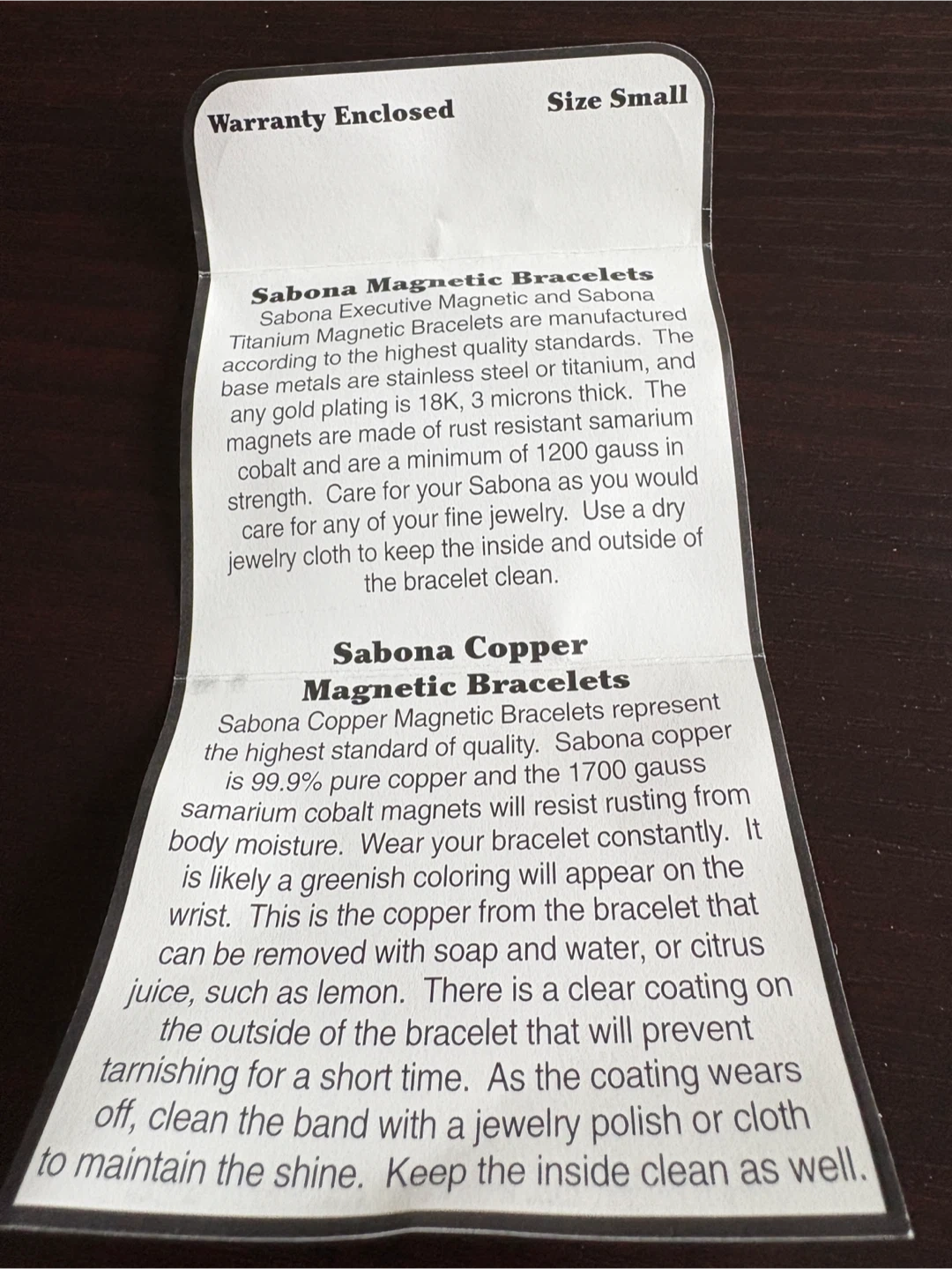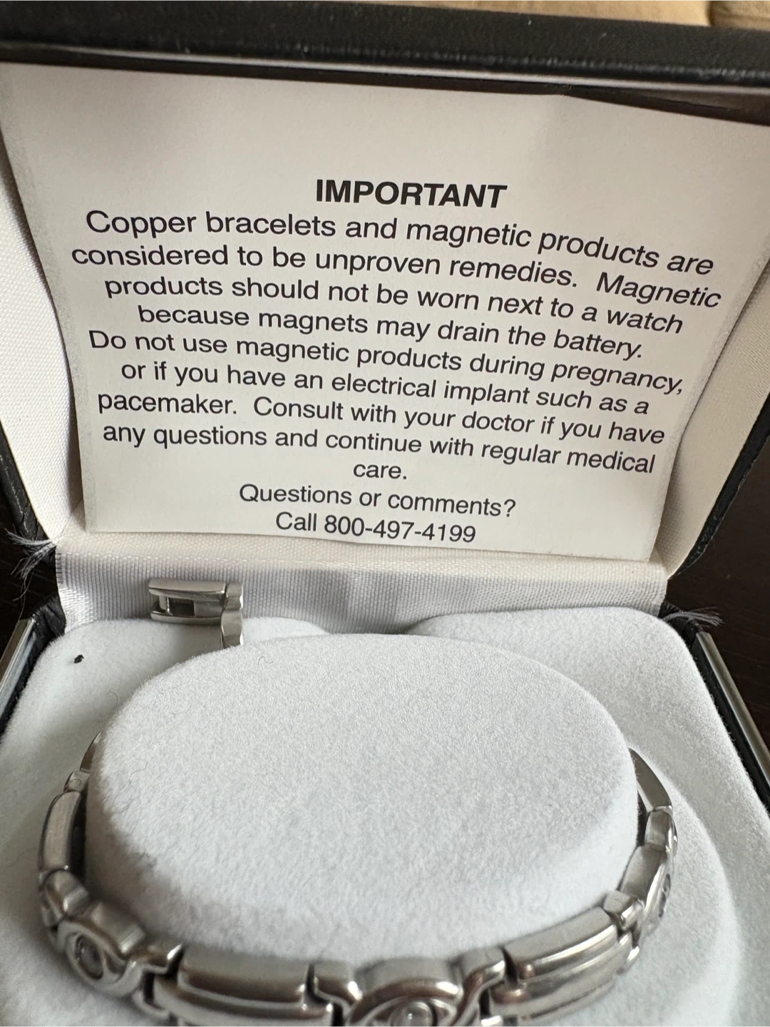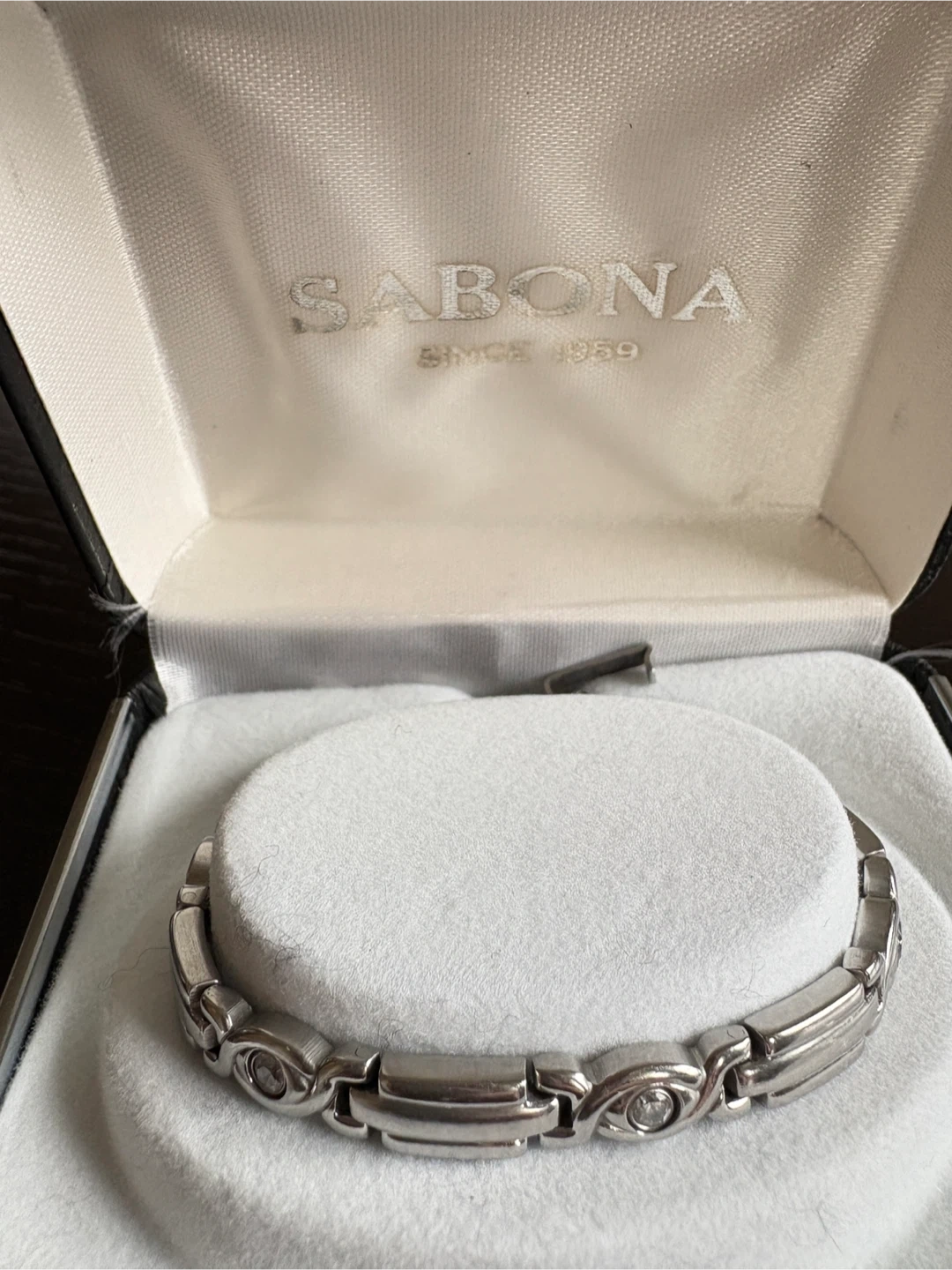 Selling a Sabona magnetic bracelet. It comes in its original box. Please note the important information included in the photos regarding magnetic products. Original price odd showing at the back of the box. Seldom wear in mint condition.