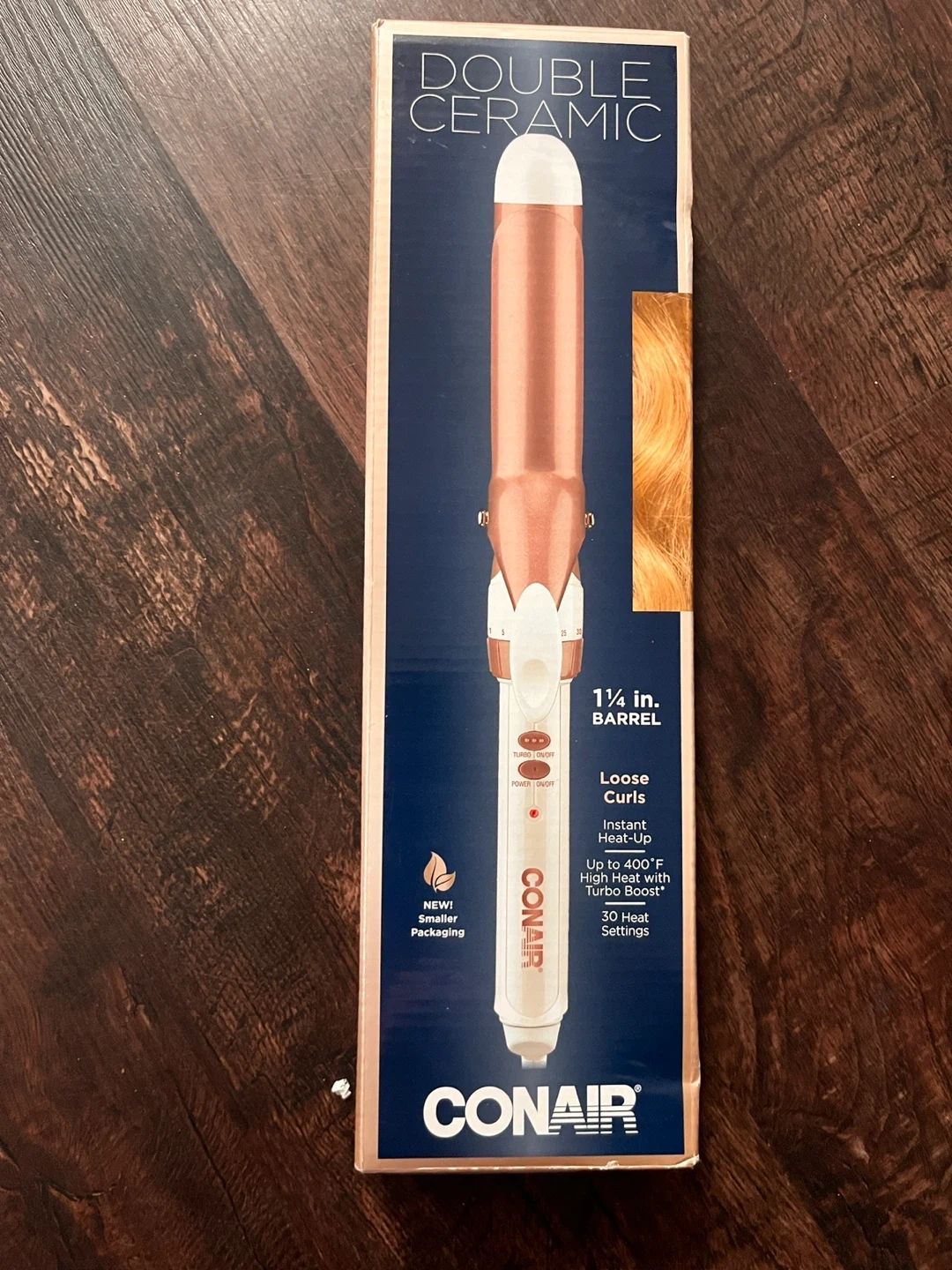 Selling a brand new Conair Double Ceramic curling iron! It features a 1 1/4 inch barrel, perfect for creating loose curls. It heats up instantly and can reach up to 400°. The original packaging is included