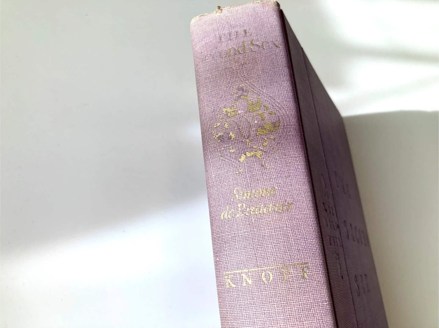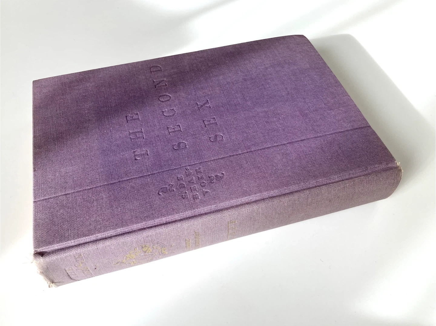 Vintage copy of "The Second Sex" by Simone de Beauvoir. Published by Alfred A. Knopf in 1957, 4th printing. First U.S. edition, translated by H.M. Parshley In a lovely lavender cloth cover with embossed text. Some wear on the gold on the spine, as well as other natural wear consistent with its age.