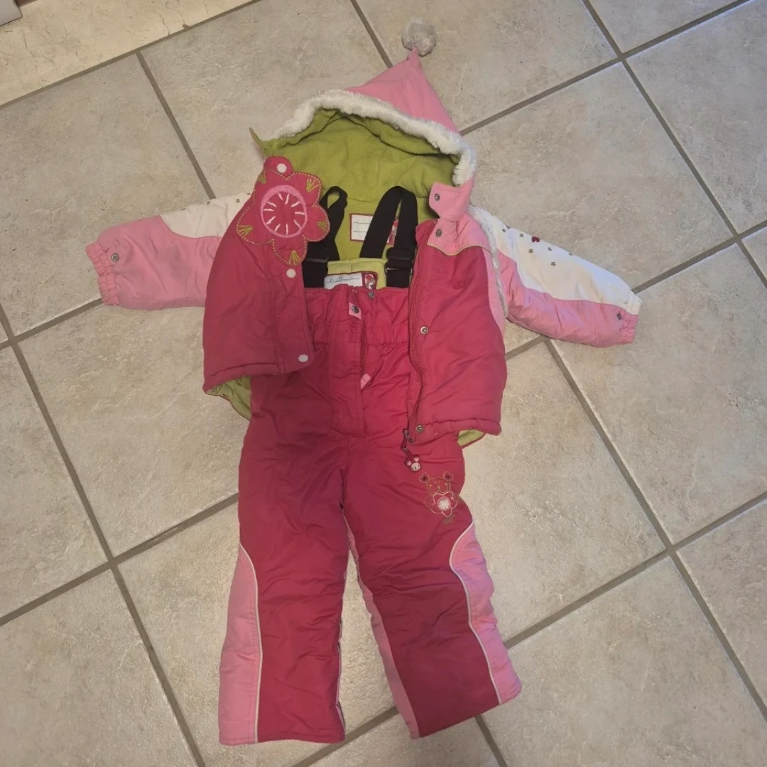 A cute and cozy snowsuit from Gagou Tagou, perfect for keeping your little one warm this winter! It's a size 24M and features a charming pink and white design. The snowsuit is in great condition and ready for snowy adventures.