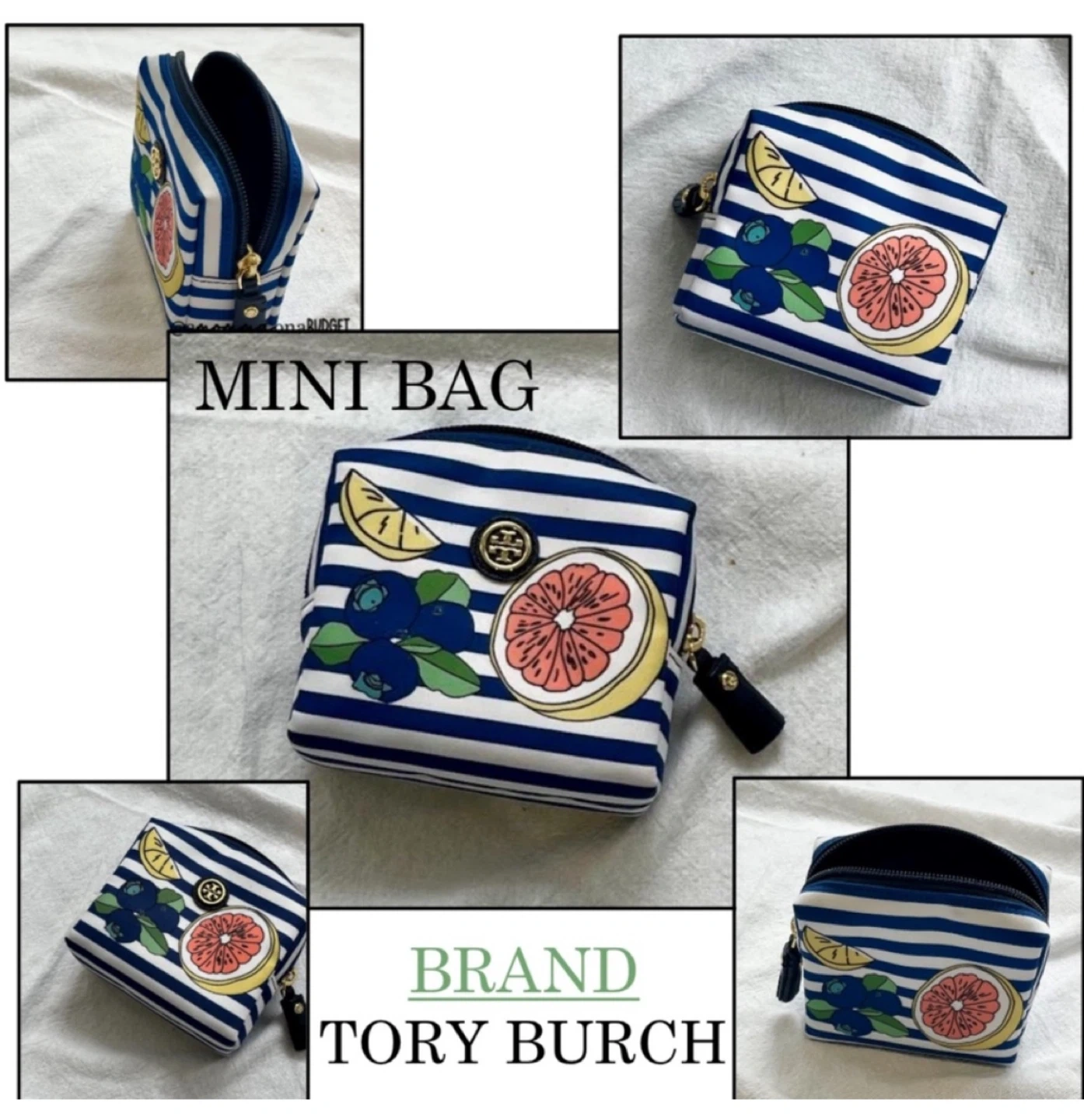 This is a cute Tory Burch mini bag! It features a blue and white striped design with fruit accents. Perfect for carrying small essentials!
