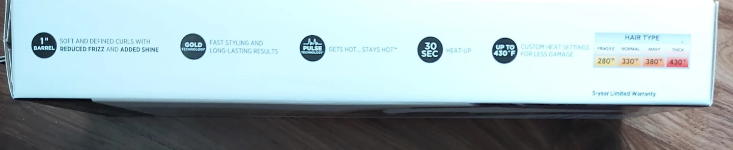This curling iron is brand new and has never been used. It is a professional grade curling iron. It has multiple heat settings and a swivel cord. It is a gold colour and has a 1 inch barrel. The box includes the curling iron and the instructions.