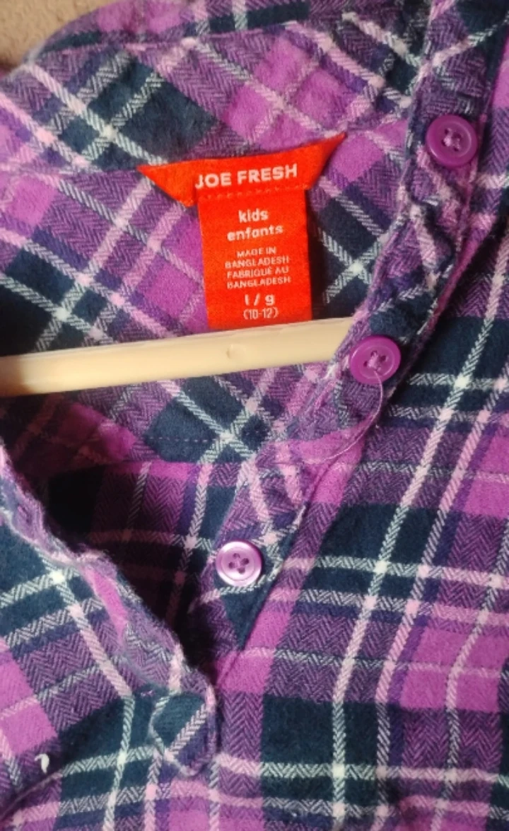 Joe Fresh kids flannel shirt for sale. It features a purple, black, and white plaid pattern. The size is 10-12 (L/G). It's in great condition and would work for a Girl OR boy!