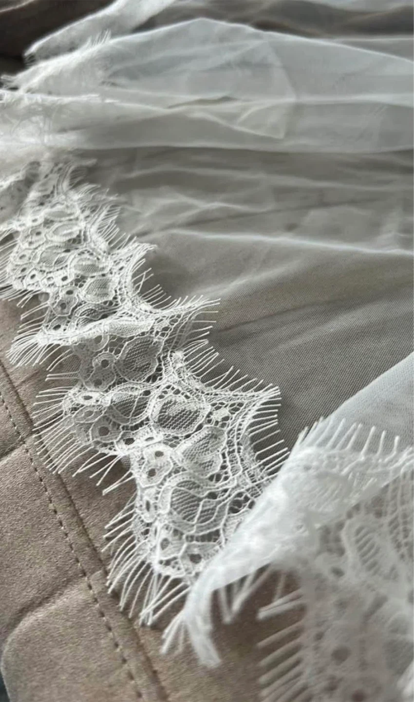 Selling a lovely white wedding veil with delicate lace trim. It's in great condition and would be perfect for your special day!