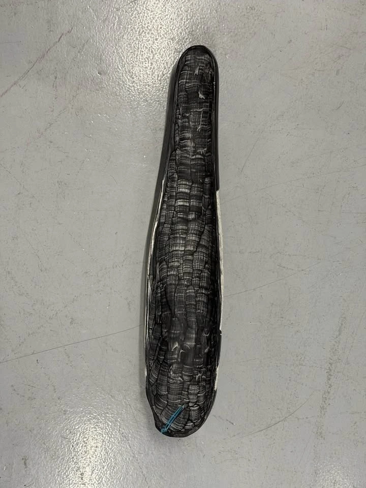 Large abstract carved wall mask in black and white.