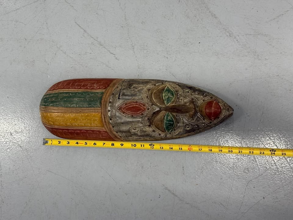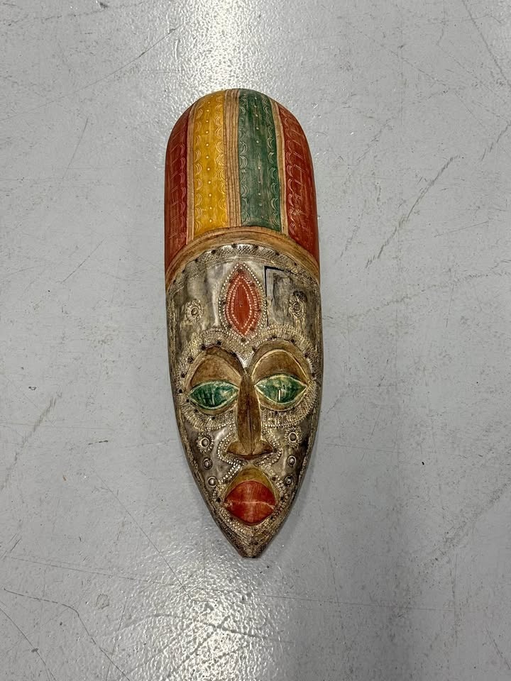 Colorful hand-painted tribal-style wall mask. Lightweight and easy to hang. Measures about 20 inches tall and features carved detail with red, green, and yellow accents.