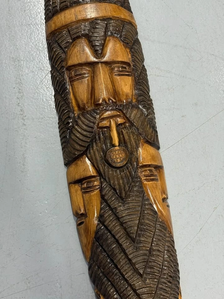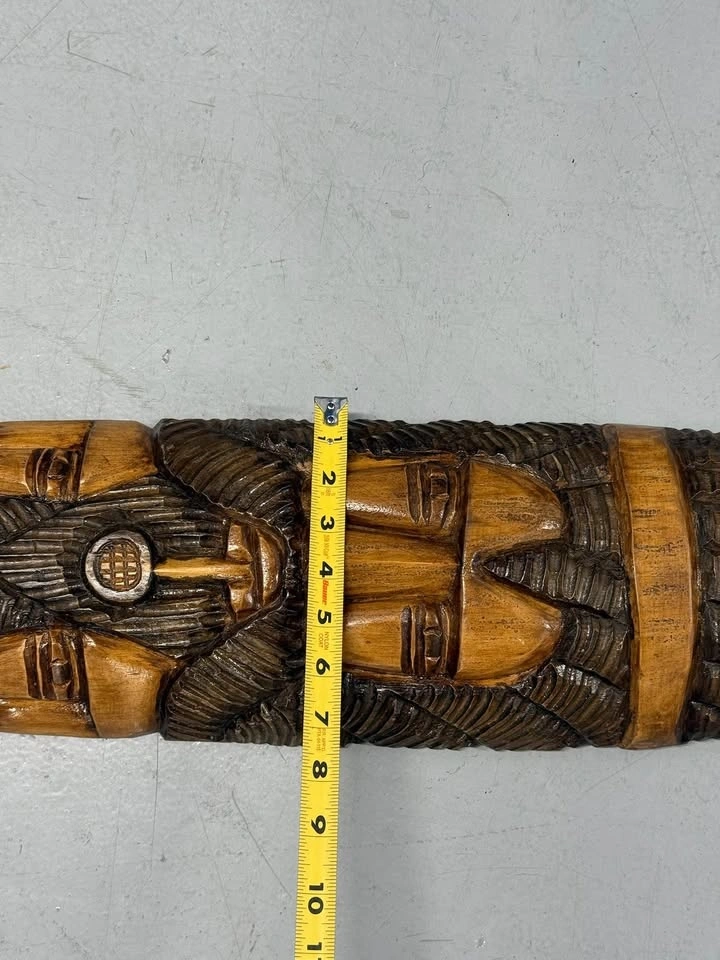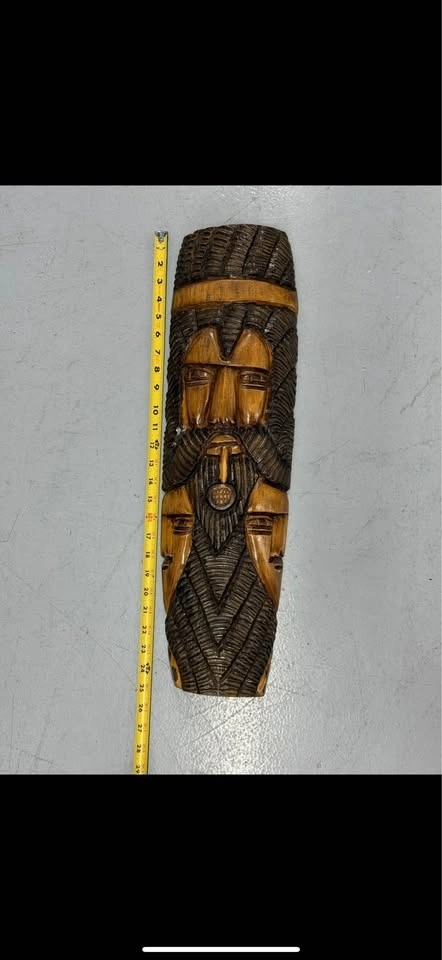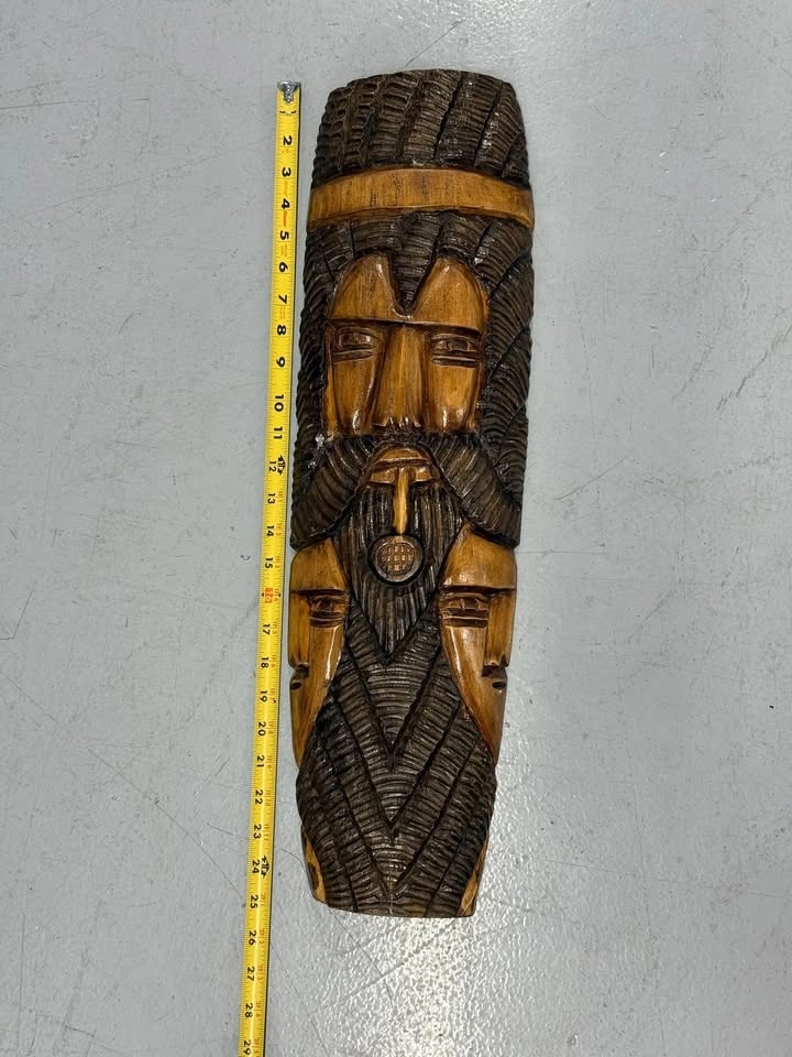 Beautiful hand-carved wooden tribal wall mask. Carved from a single solid piece of wood with a multi-face design and deep textured detail. Roughly 24–25 inches tall and 6 inches wide. Good condition with natural variations from the carving.