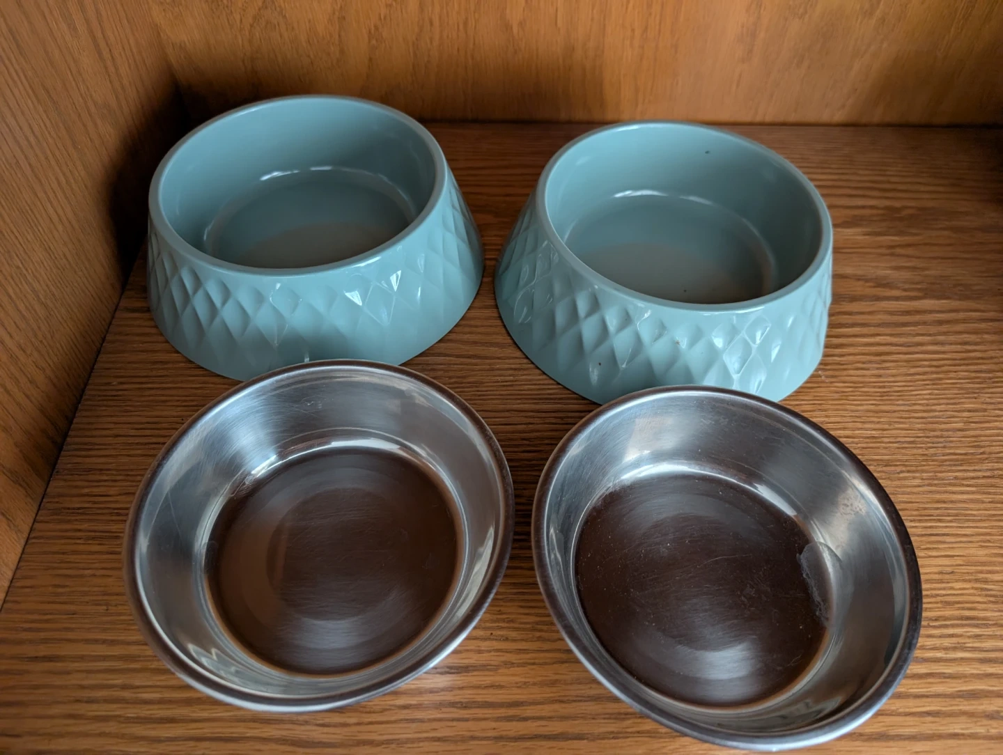 Selling two elevated pet bowls. They have a nice stainless steel interior and a pretty light blue patterned exterior. Great for keeping your furry friend comfy while they eat