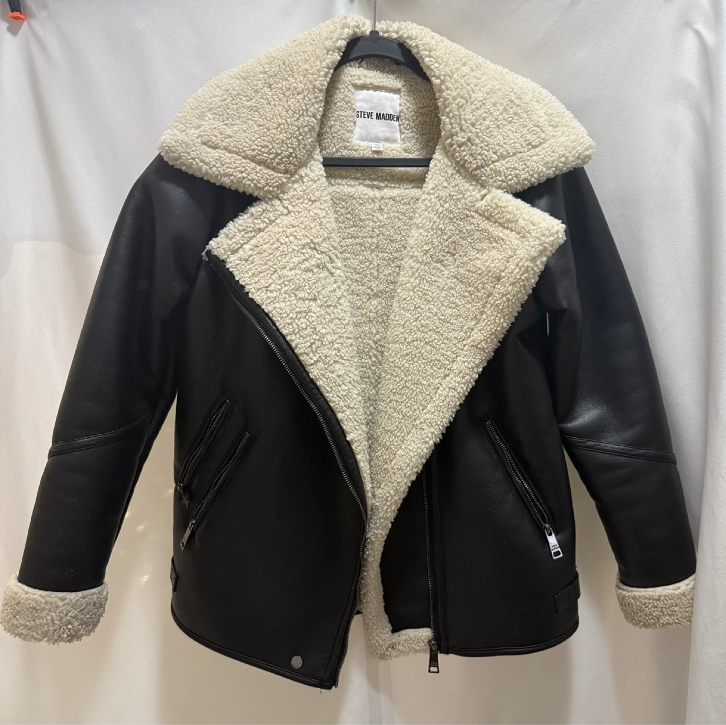 Here's a stylish Steve Madden aviator jacket! It's made of black faux leather with a cozy, cream-coloured sherpa lining. Perfect for staying warm and looking great!