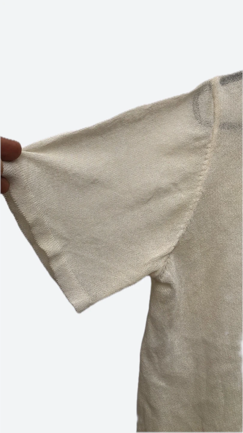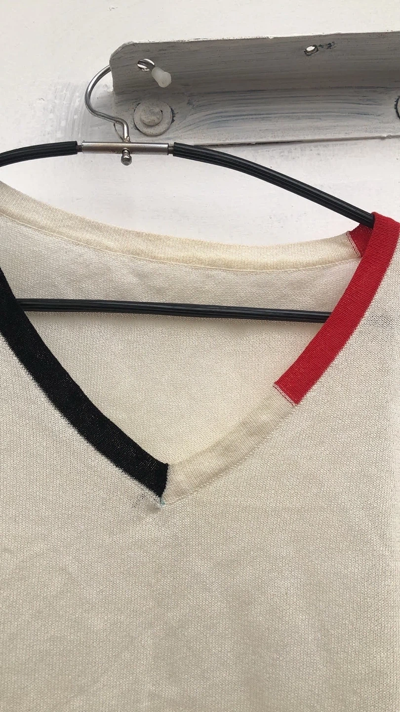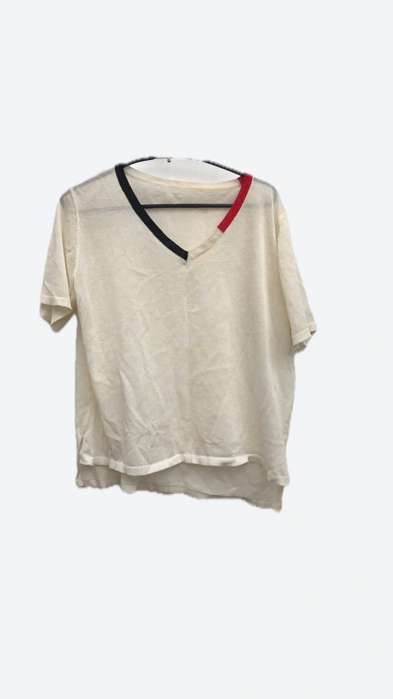 Here’s a cream-coloured V-neck short sleeve top! It has a unique design with black and red accents on the neckline. Perfect for a casual and stylish look