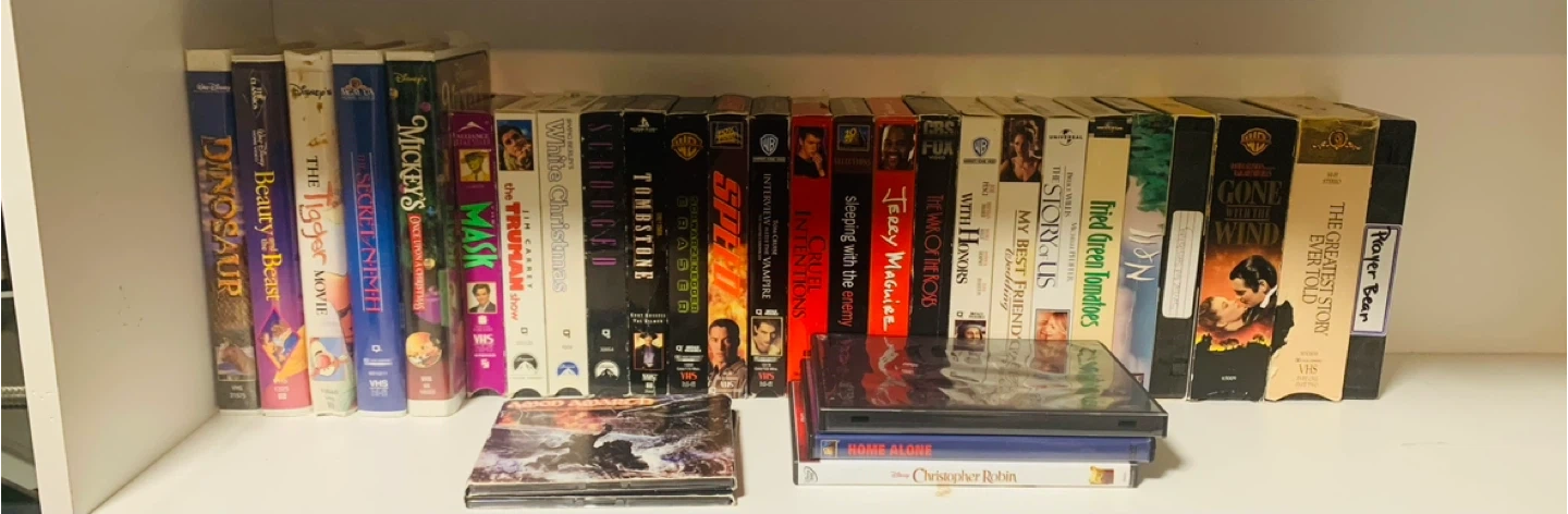 Selling a box of VHS and DVD movies. Titles include classics like "The Truman Show", "White Christmas", "Speed", "The Mask", "Beauty and the Beast", and many more! Great for collectors or anyone looking to relive some nostalgia