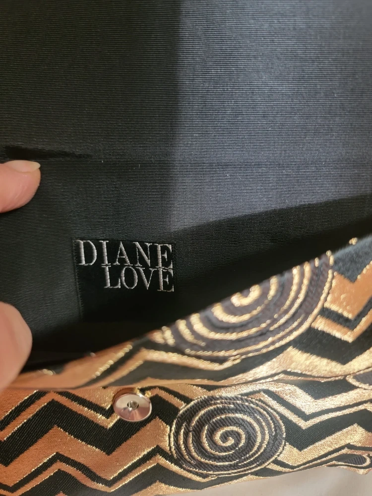 This Diane Love clutch features a striking pattern of zigzags, clouds, and spirals in black and gold tones! It's in great condition and perfect for adding a touch of elegance to any outfit. Some selling on line for over $150.00