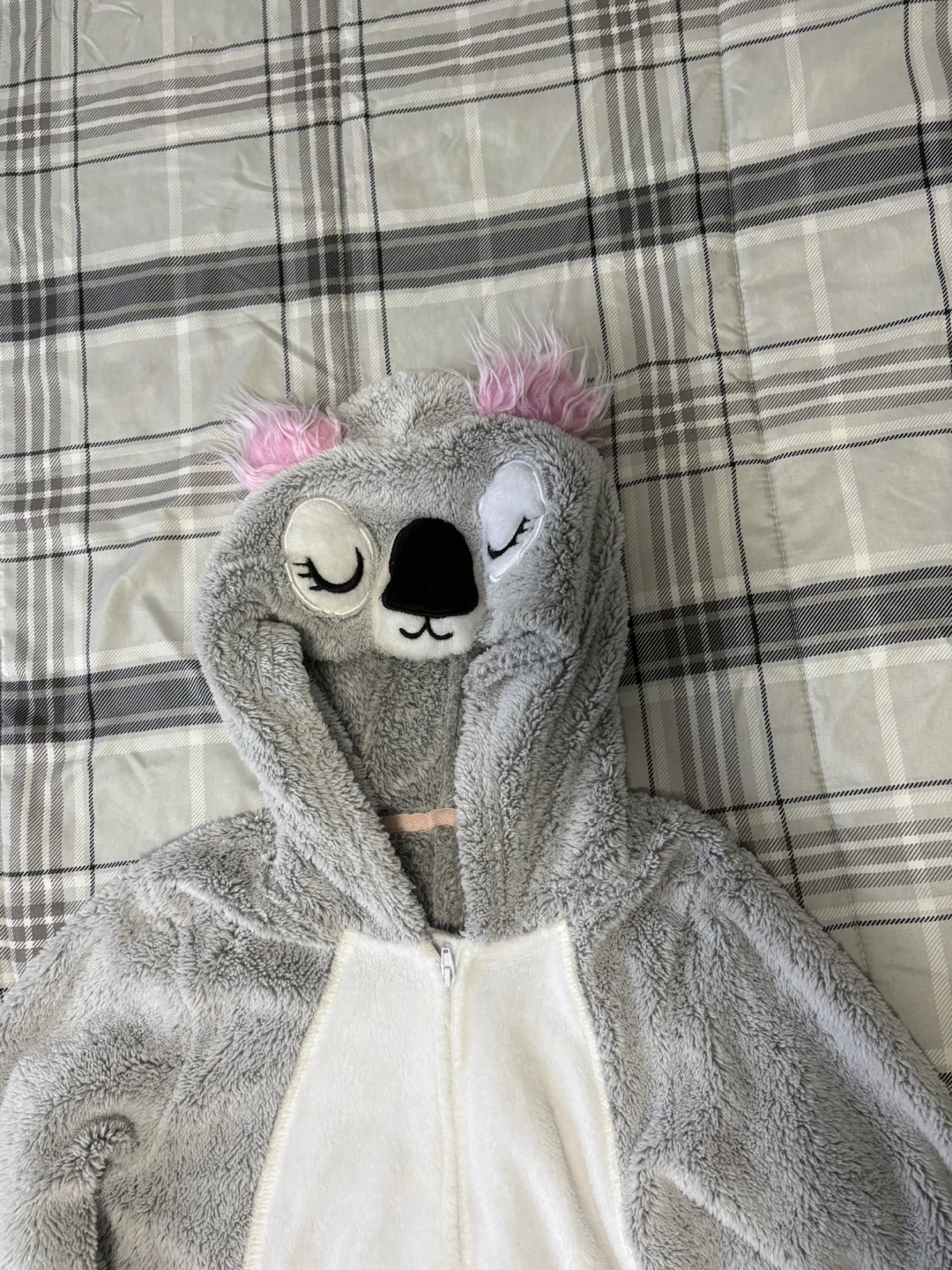 Selling a koala onesie! It's grey with a white belly and pink accents. Size is M and it's in good condition. Perfect for lounging around the house!
