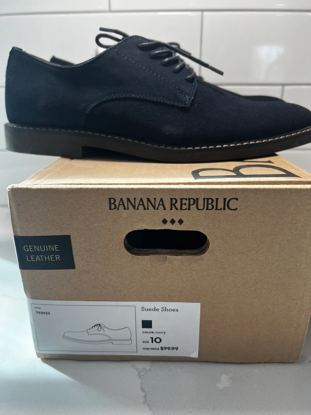 Selling a new pair of men’s Banana Republic suede shoes in navy, size 10.