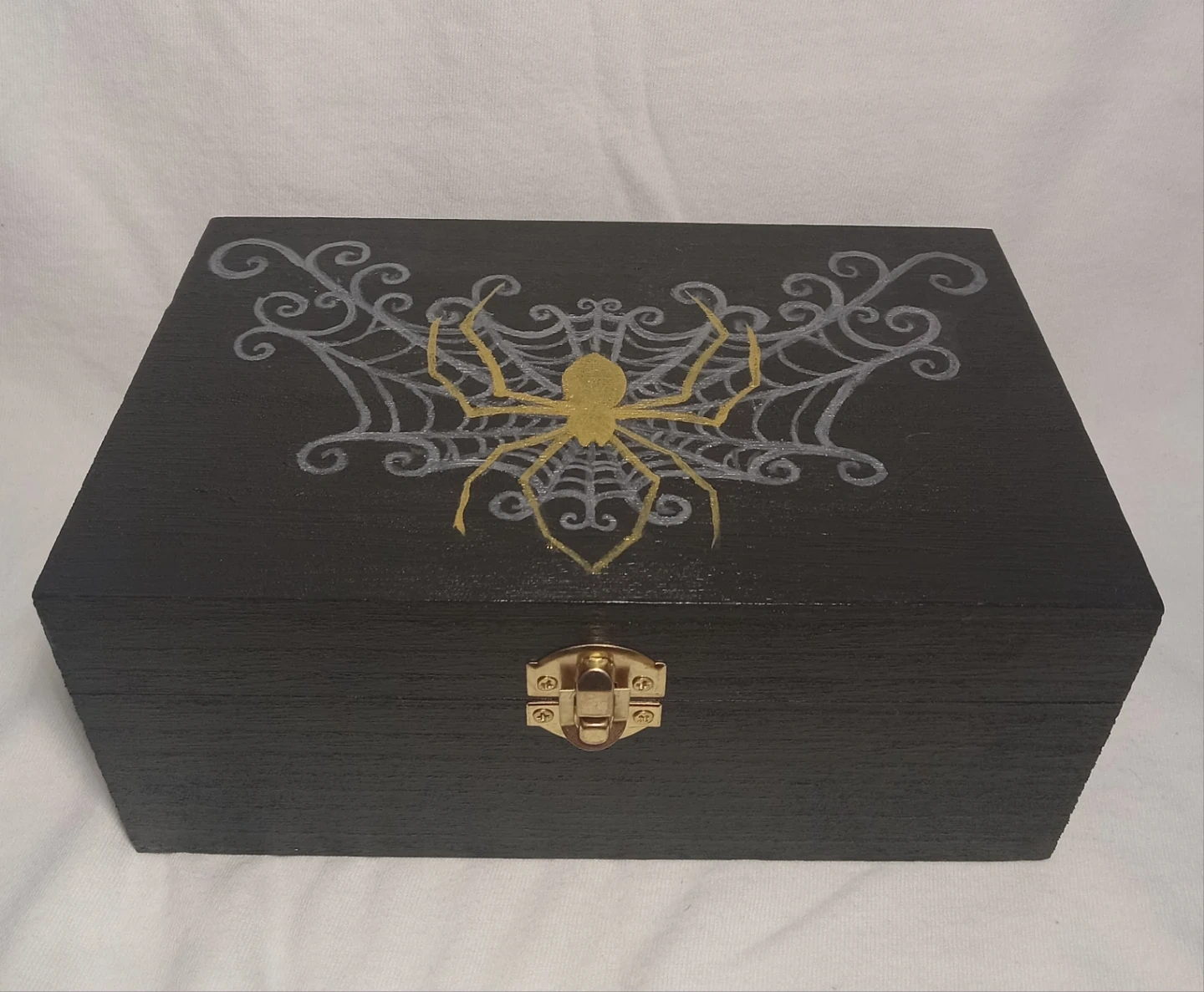 Here's a unique, hand-painted wooden box! It features a cool spiderweb design on top, and the inside is lined with a soft red felt. Perfect for storing jewelry, trinkets, or other small treasures. It's in great condition and ready for a new home!