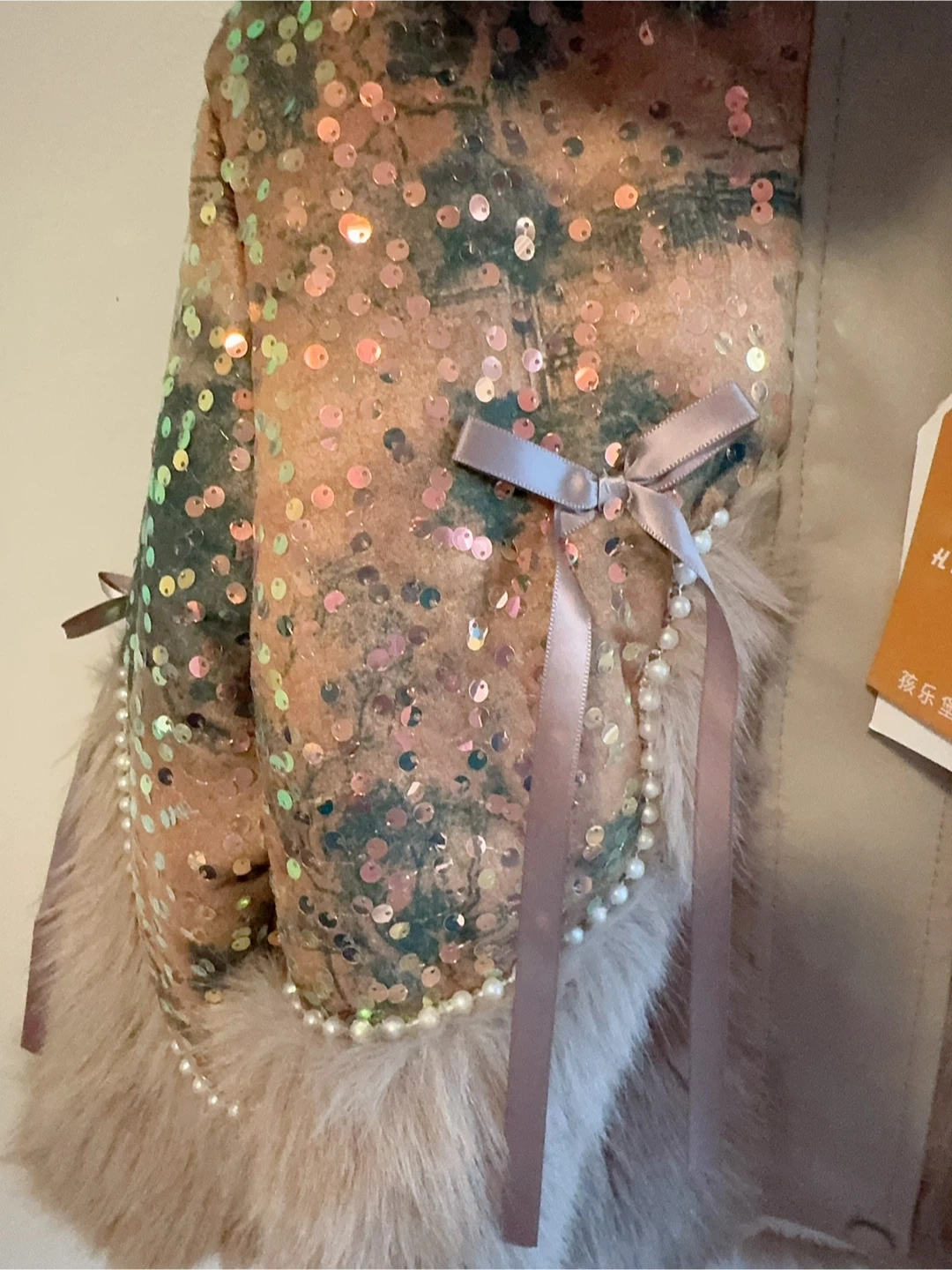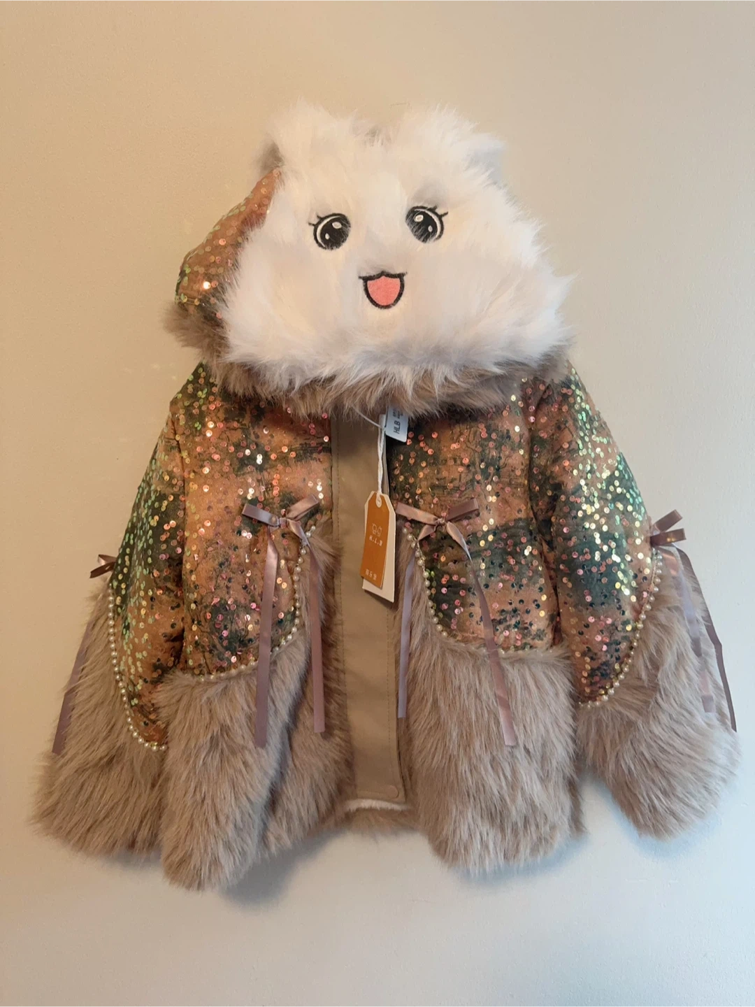 This is a cute bunny jacket with fur trim and sequin details! It has a fluffy removable bunny face on the front.