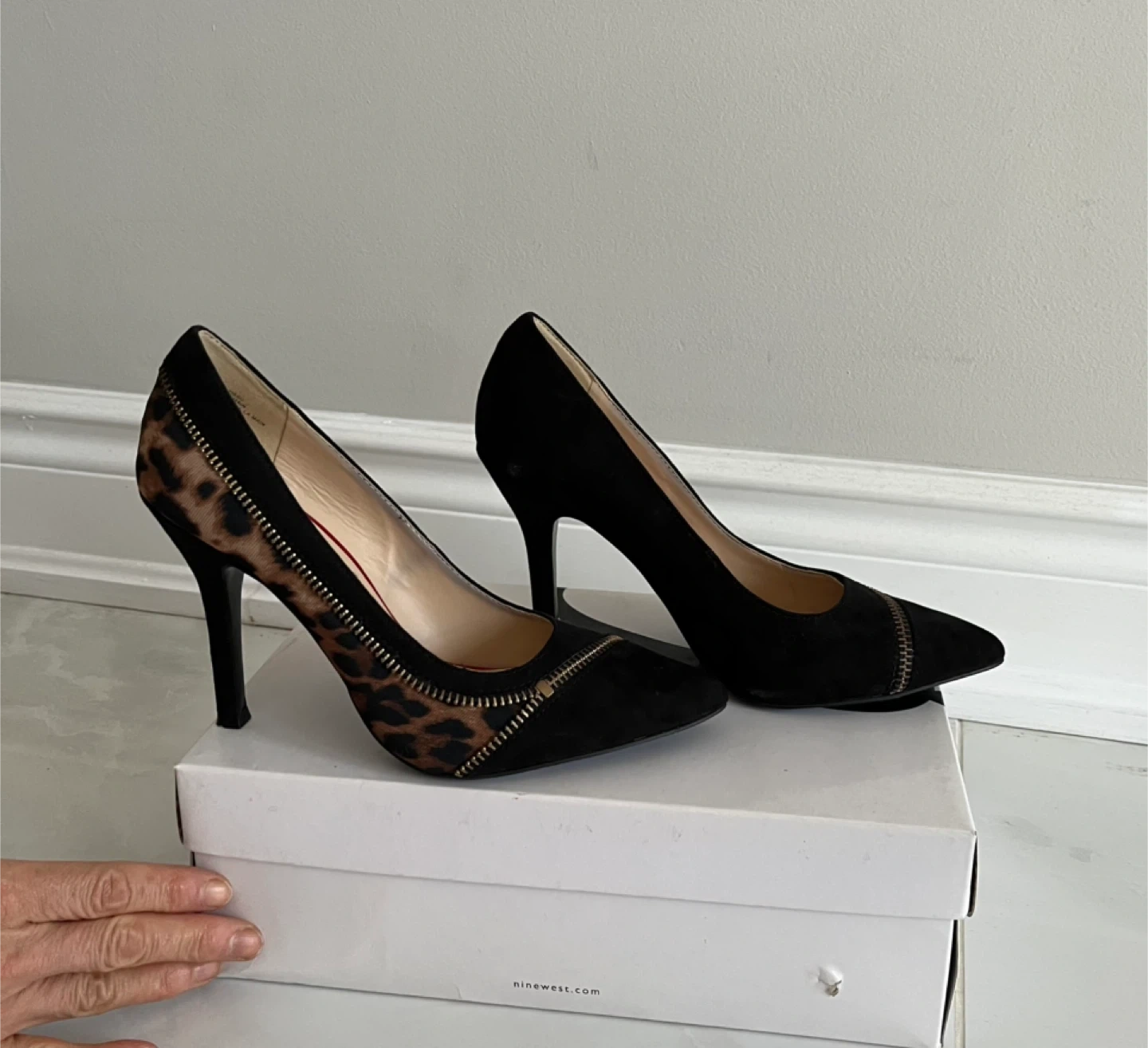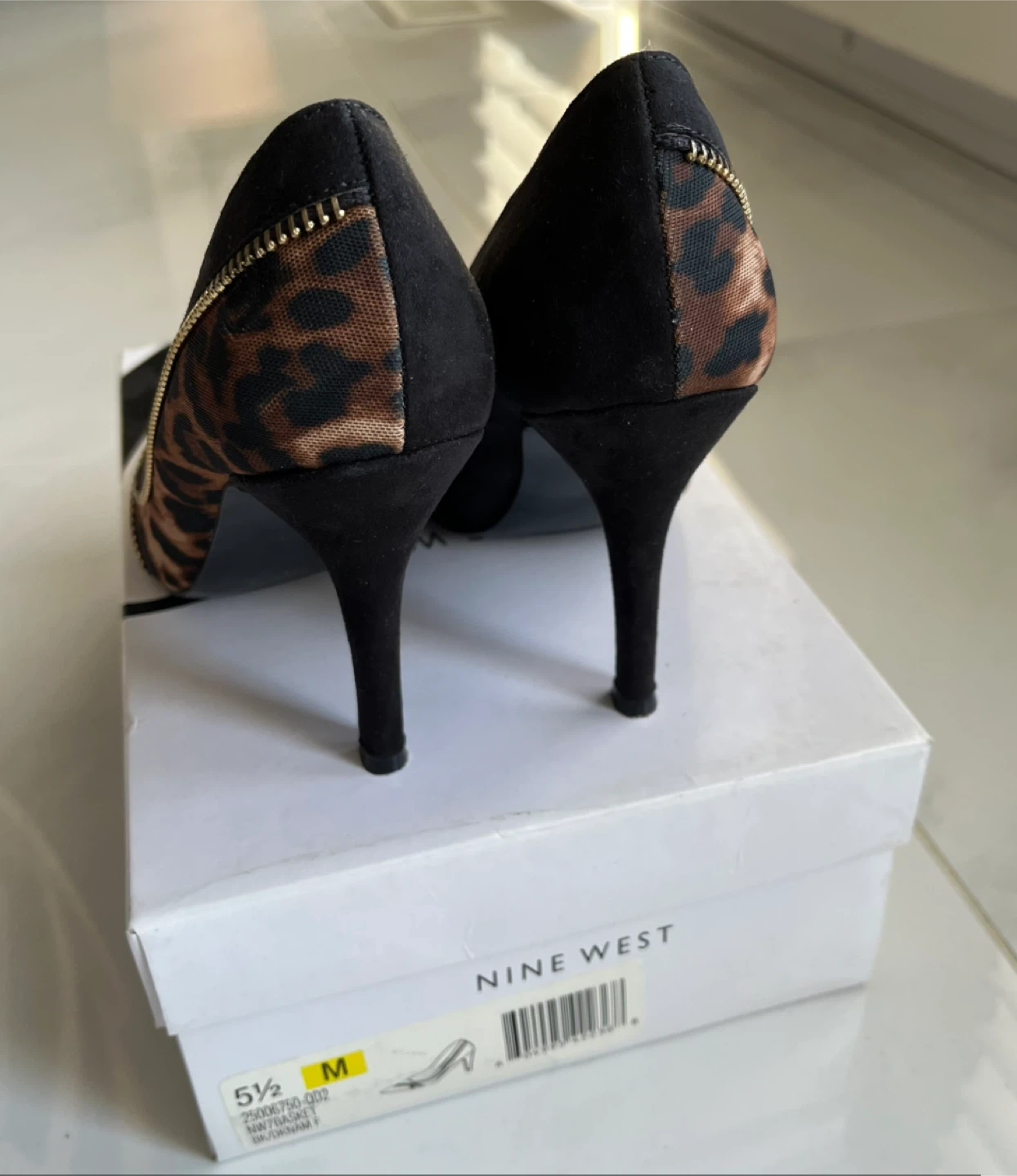 -Leopard print and black suede accents.