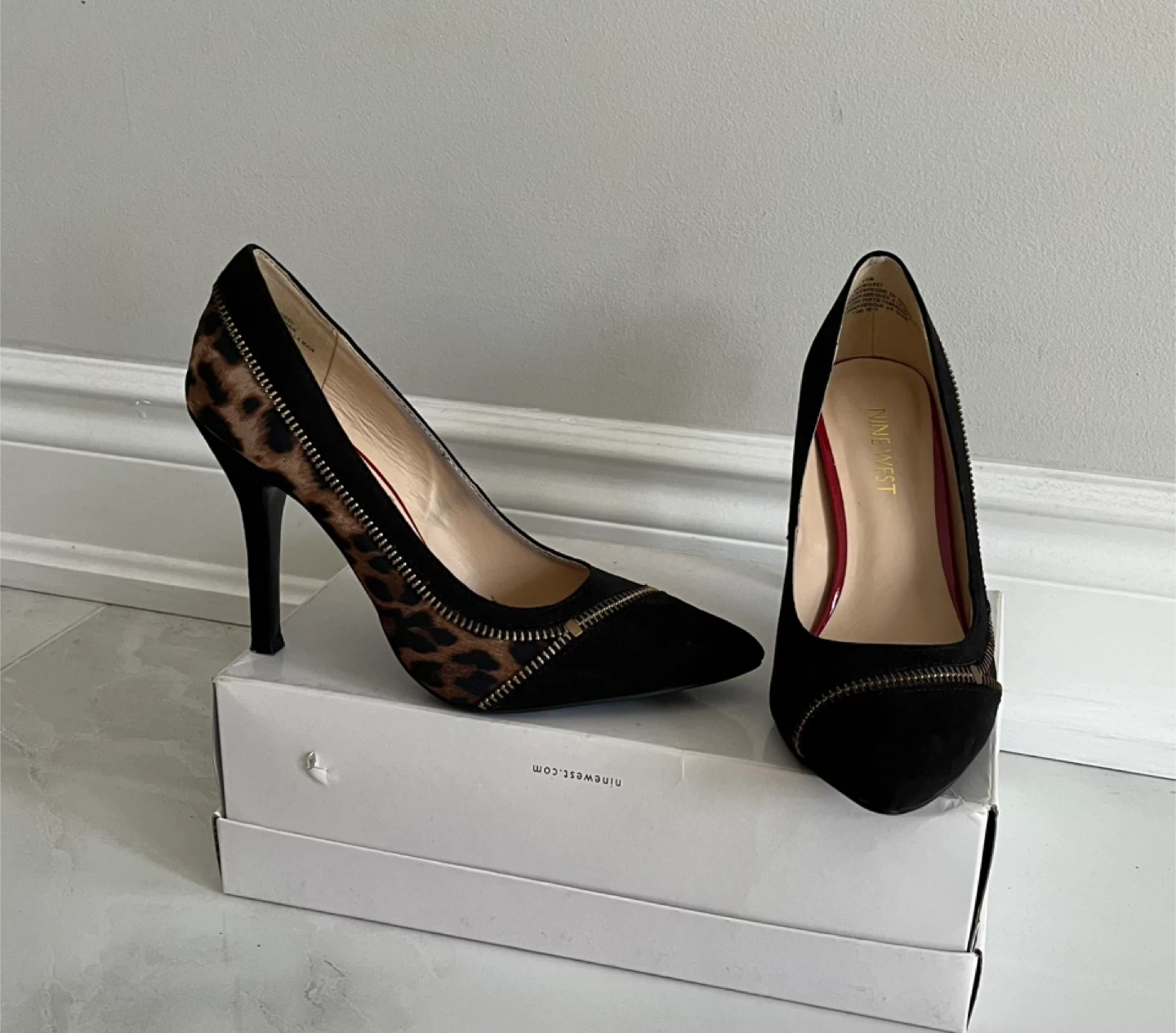 -Leopard print and black suede accents.