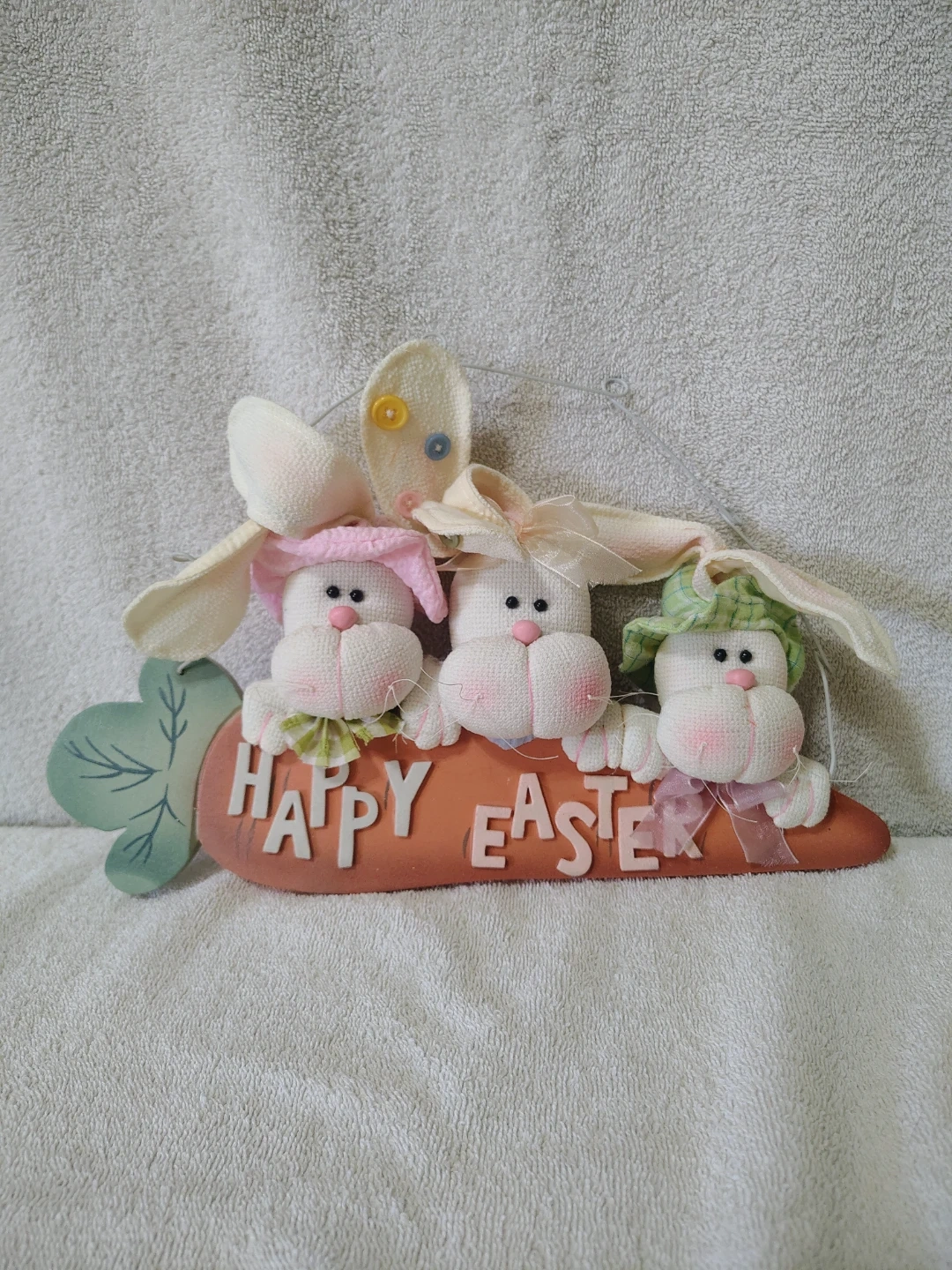 Here's a cute Happy Easter decoration featuring three bunnies sitting on a carrot! It's perfect for adding a touch of spring to your home