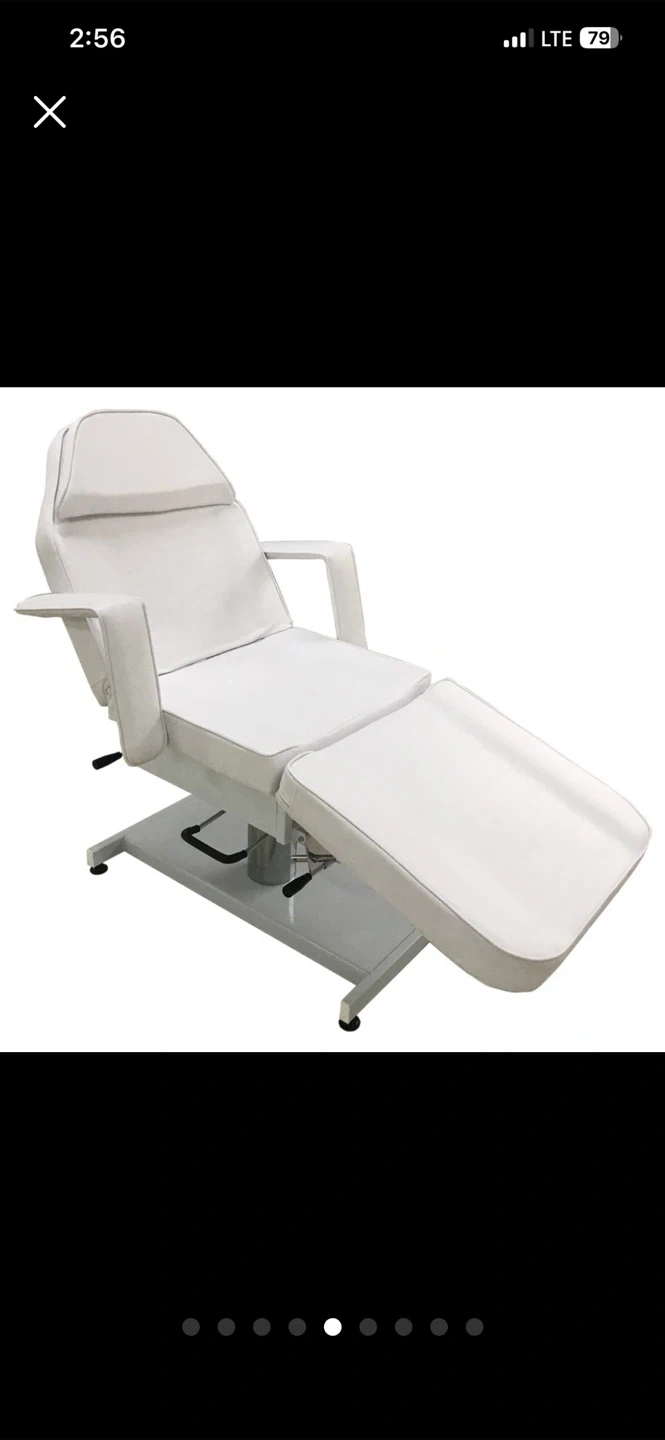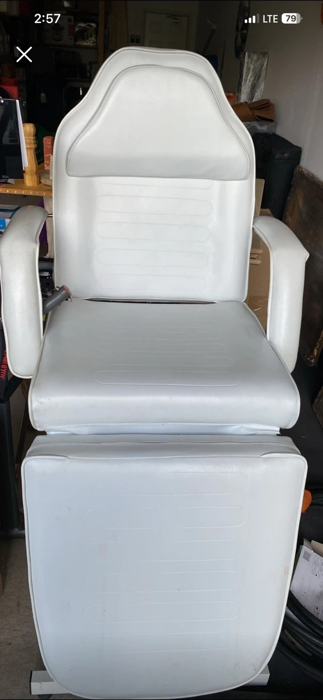 Selling a white adjustable treatment chair. It's in good condition and would be perfect for a spa or salon setting. It's comfortable and easy to adjust to different positions.