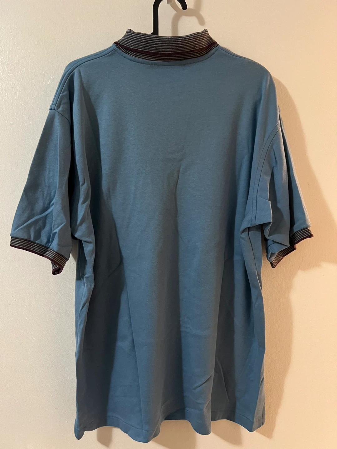 Here's a Brooks Brothers polo shirt in size large. It's made of 100% cotton and has a cool, classic look. The colour is a nice light blue. Perfect for a casual day out!