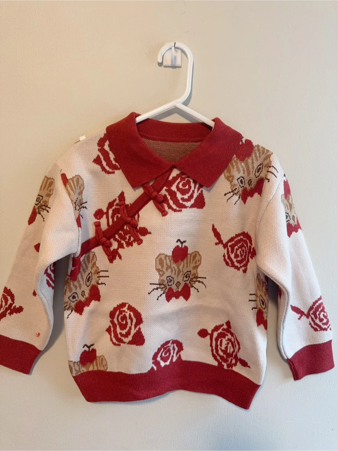 This adorable little outfit includes a sweater with a unique clasp and a matching skirt. Both pieces feature a charming pattern of roses and cats. The inside of the skirt is lined with a soft white material for extra comfort. Perfect for your little one!