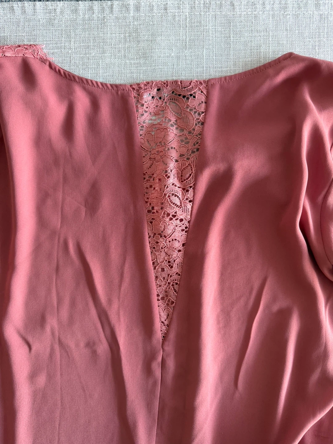 Selling a lovely Mango Suit dress! It's a beautiful shade of pink and features delicate lace detailing. The dress is a size S and in great condition. Perfect for any occasion! There’s a small iron mark, but you can barely see it. Photo attached.