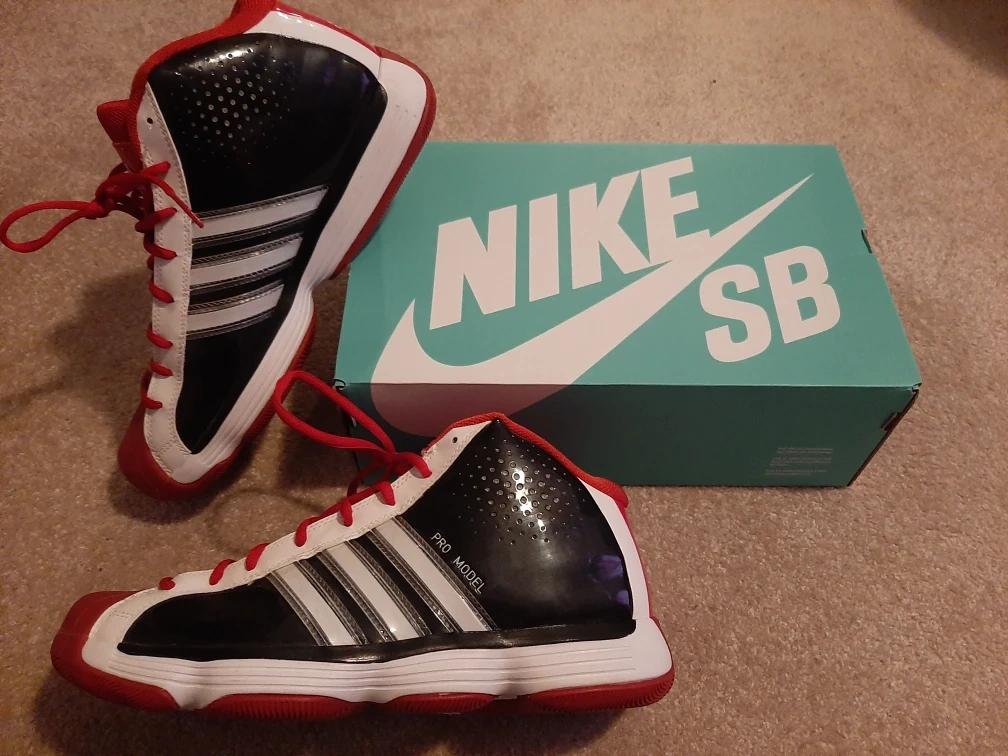 Selling a pair of Adidas Pro Model basketball shoes. They're red, white, and black. Size 11. Please take a look at the photos to see the condition!