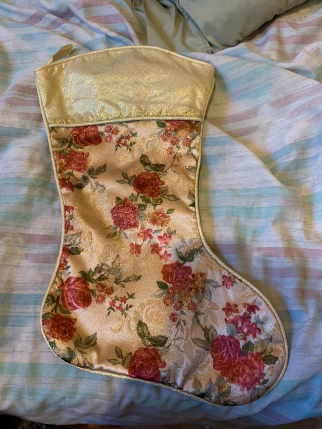 Here's a lovely floral Christmas stocking! It features a gold-colored top and a beautiful floral pattern in shades of red and pink on a beige background. Perfect for adding a touch of elegance to your holiday decor