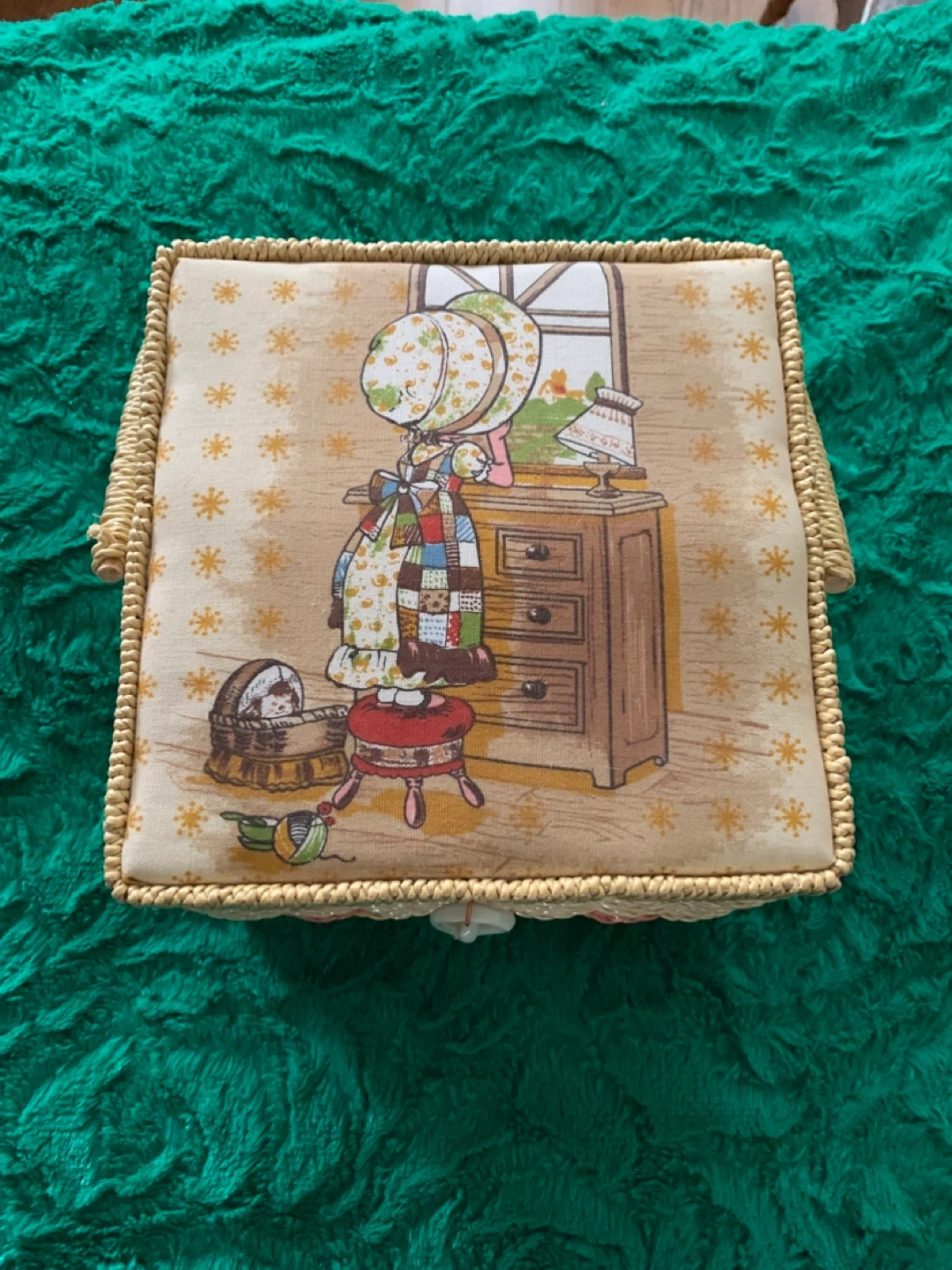 Selling a vintage wicker sewing basket. It has a cute design on the lid and a padded interior. Perfect for storing your sewing supplies or other small items!