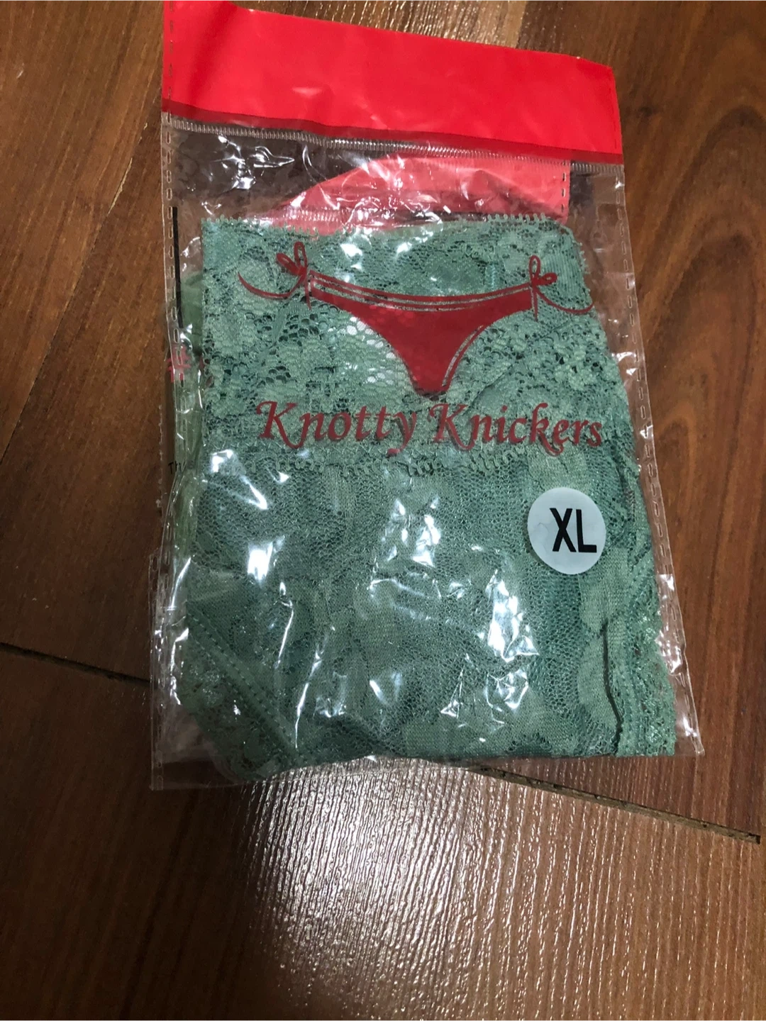 Selling a brand new Knotty Knickers thong. It's a beautiful green lace and is size XL. Comes in original packaging!