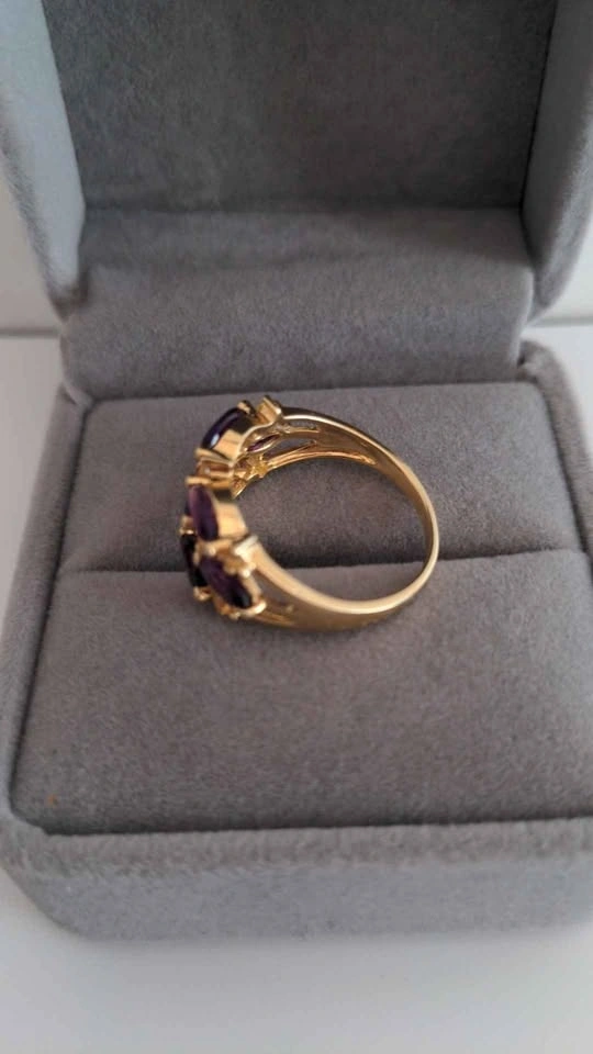 New elegant gold-rhodium plated sterling silver ring featuring vibrant marquise-cut natural amethyst and round-cut citrine gemstones totaling 1.85 carats. Ring weighs approximately 7.75g and fits a size 7.5 finger. Resizable. A striking blend of purple and golden hues, ideal for collectors or everyday wear. Stamped and verified.