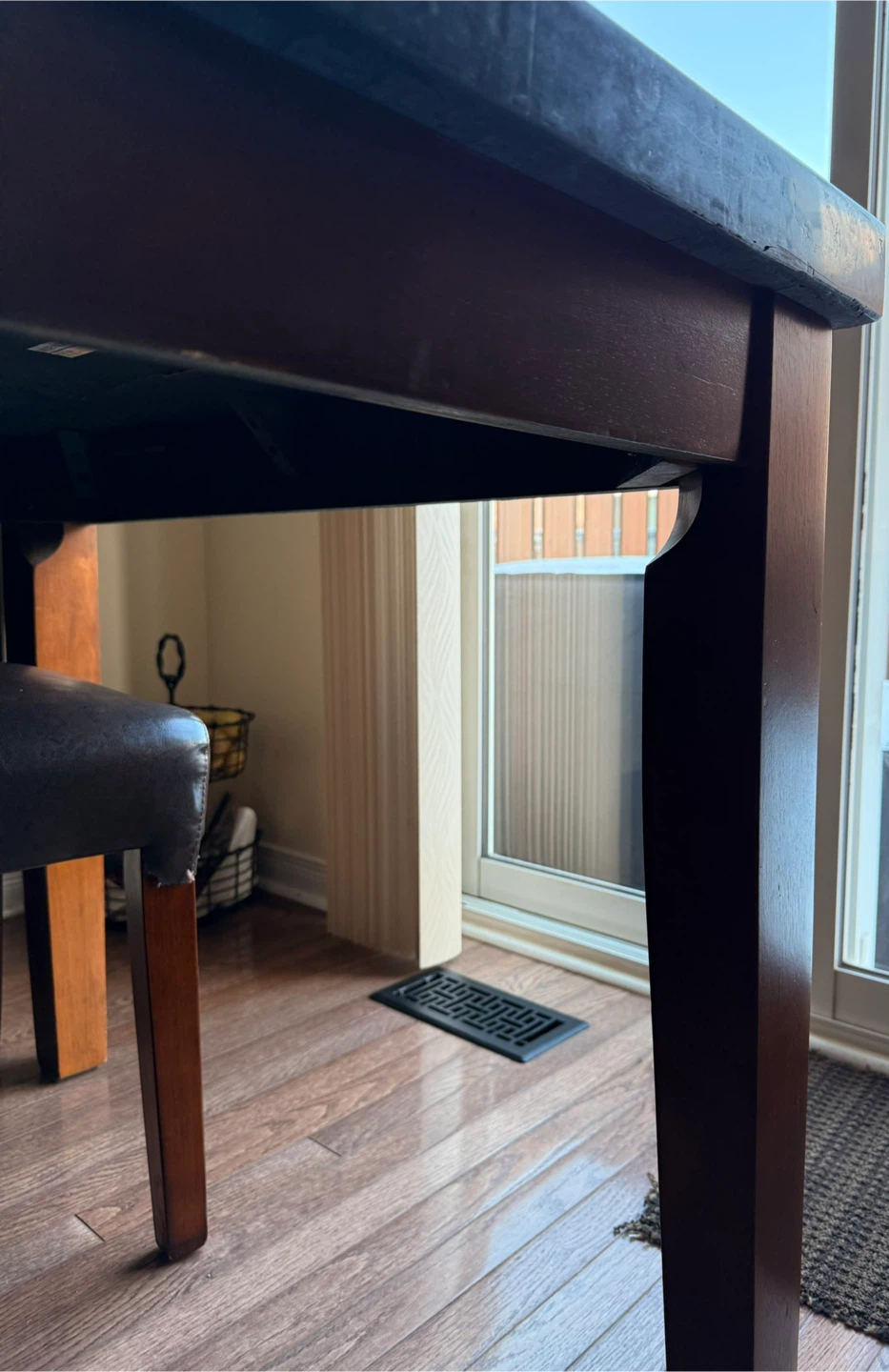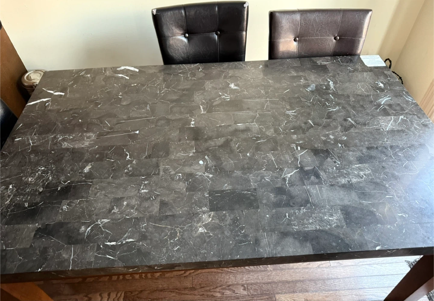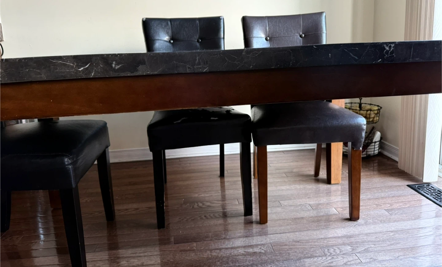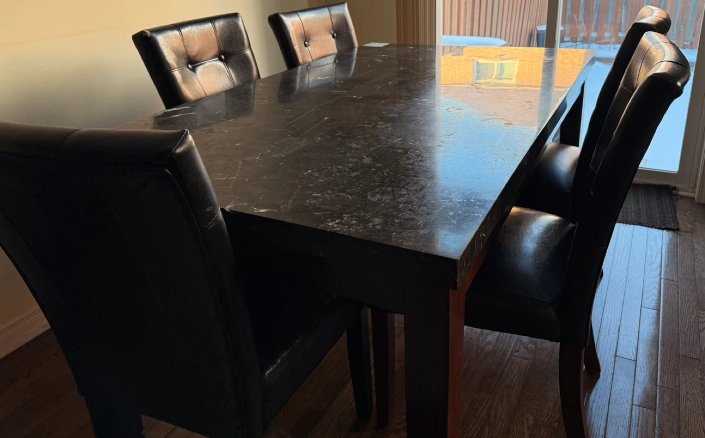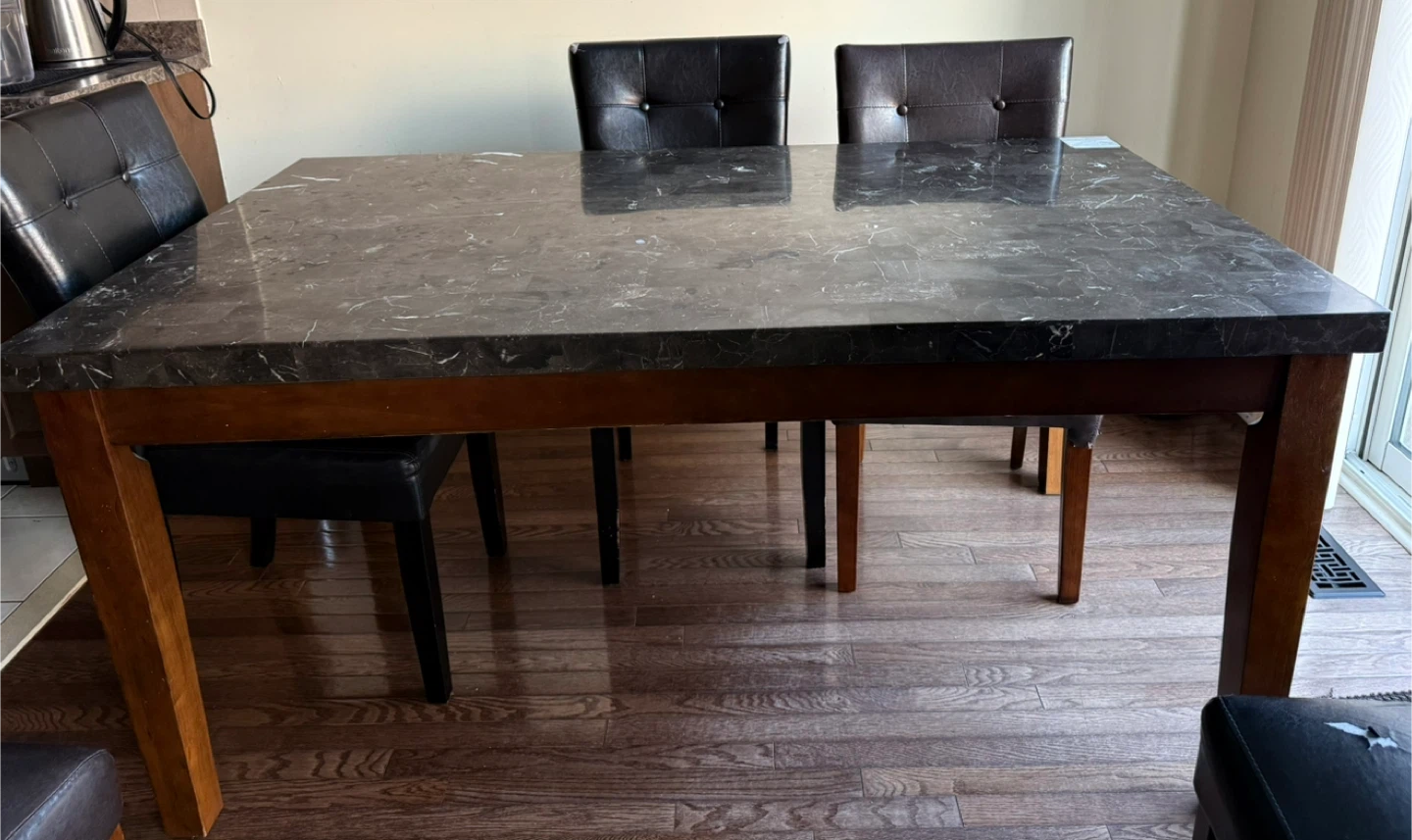 I'm selling a dining table that features a marble top and a sturdy mahogany wood base. It comfortably seats 4-6 people. The chairs are also included but if you're interested in just the table, please let me know.